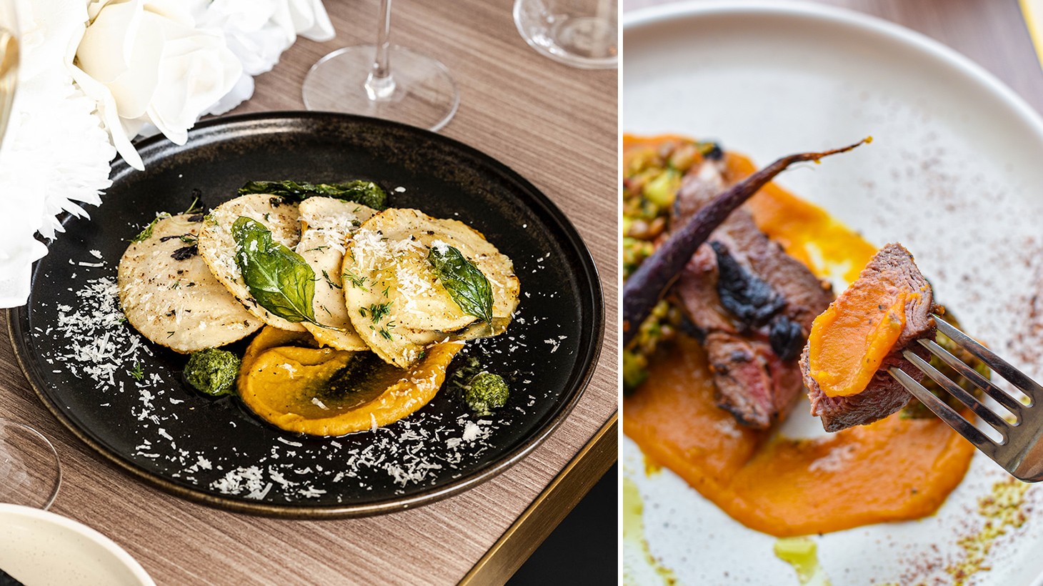 - Black Angus beef fillet, black garlic butter, truffle mash, wild mushroom, pink peppercorn jus