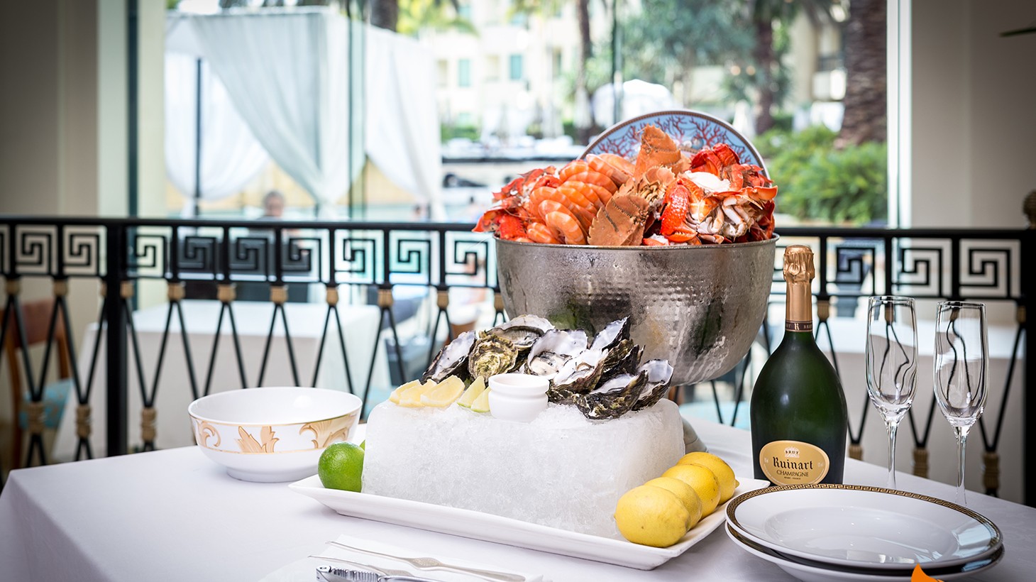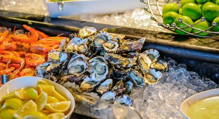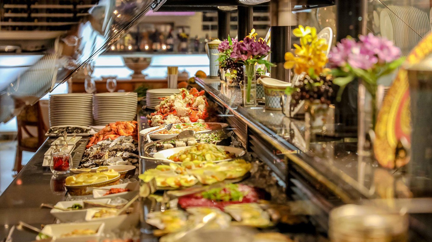 • Two-hour sitting for all-you-can-eat seafood buffet dinner with a seasonal selection of international dishes