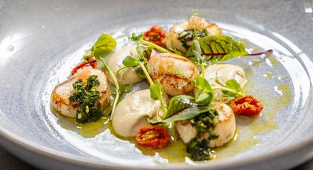 - Seared Shark Bay scallops with Jerusalem artichoke puree, semi-dried cherry tomatoes, finger lime dressing