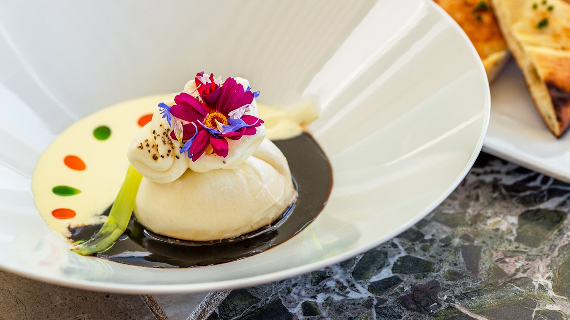 • Course One: The Famous Burrata: House-made mozzarella ball stuffed with Pugliese mascarpone cheese, infused with Margaret River truffle honey, 24-year-old Modena Balsamico glaze, white truffle cream, basil & paprika emulsion. Served with wood-fired bread