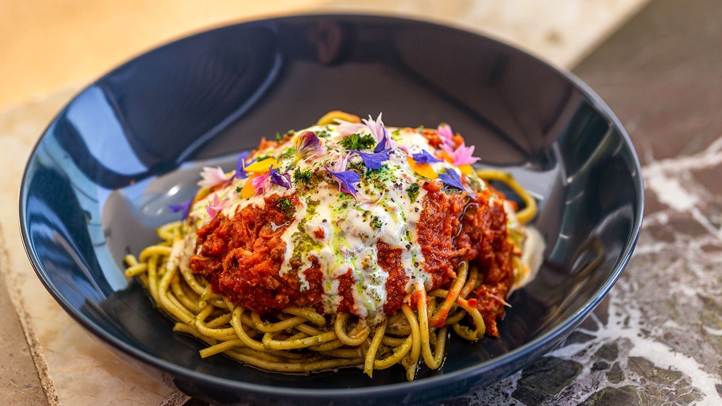 • Course Two: Ragu Australiana: 48-hour slow braised kangaroo and wagyu beef, handmade pesto spaghetti pasta, gorgonzola bechamel, aged Parmigiano Reggiano