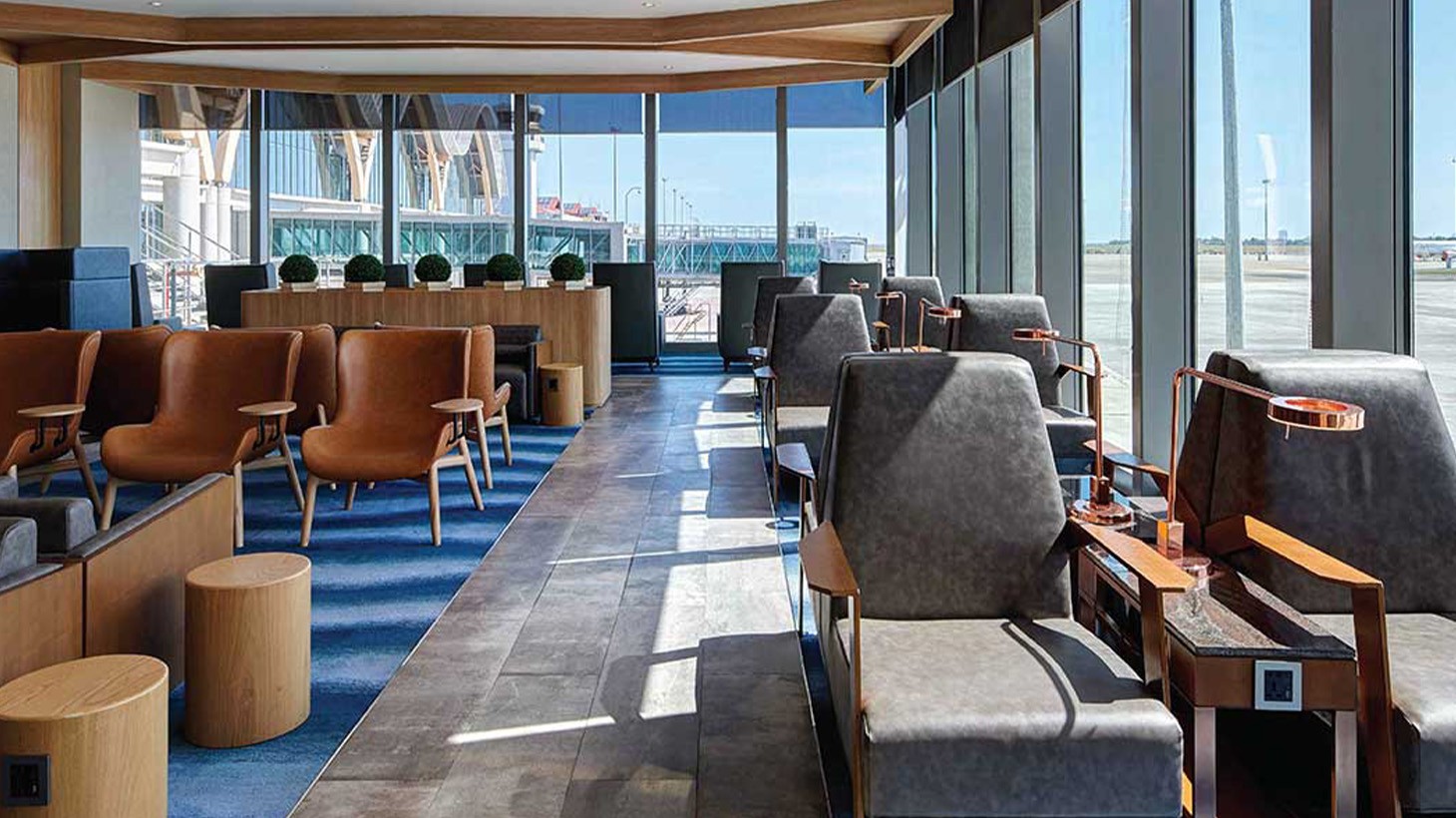 • Comfortable lounge seating with wifi, flight information and charging stations