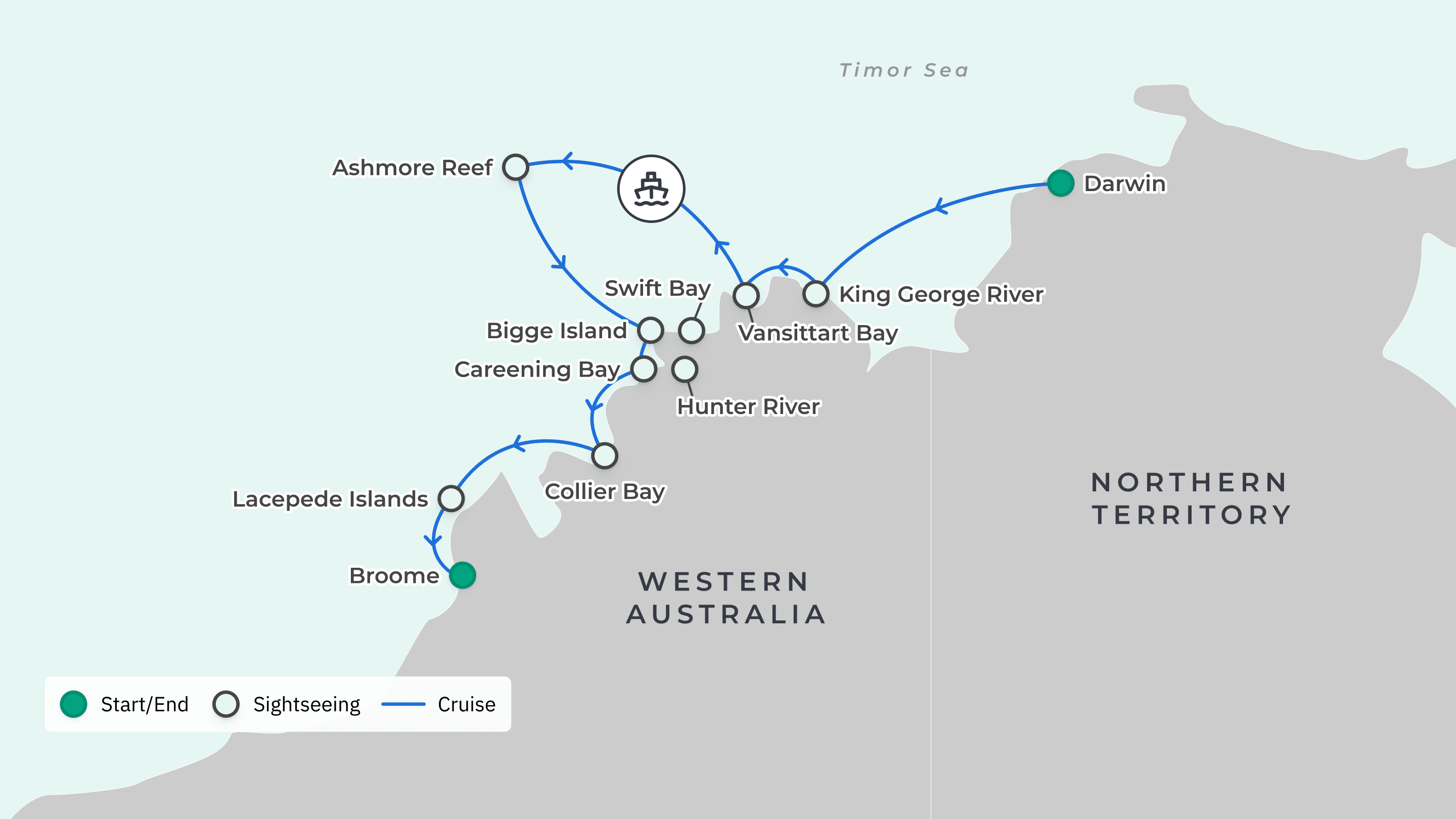 Your journey takes you to: Darwin – King George River – Vansittart Bat – Ashmore Reef – Bigge Island – Careening Bay – Swift Bay – Hunter River – Collier Bay – Lacepede Islands – Broome