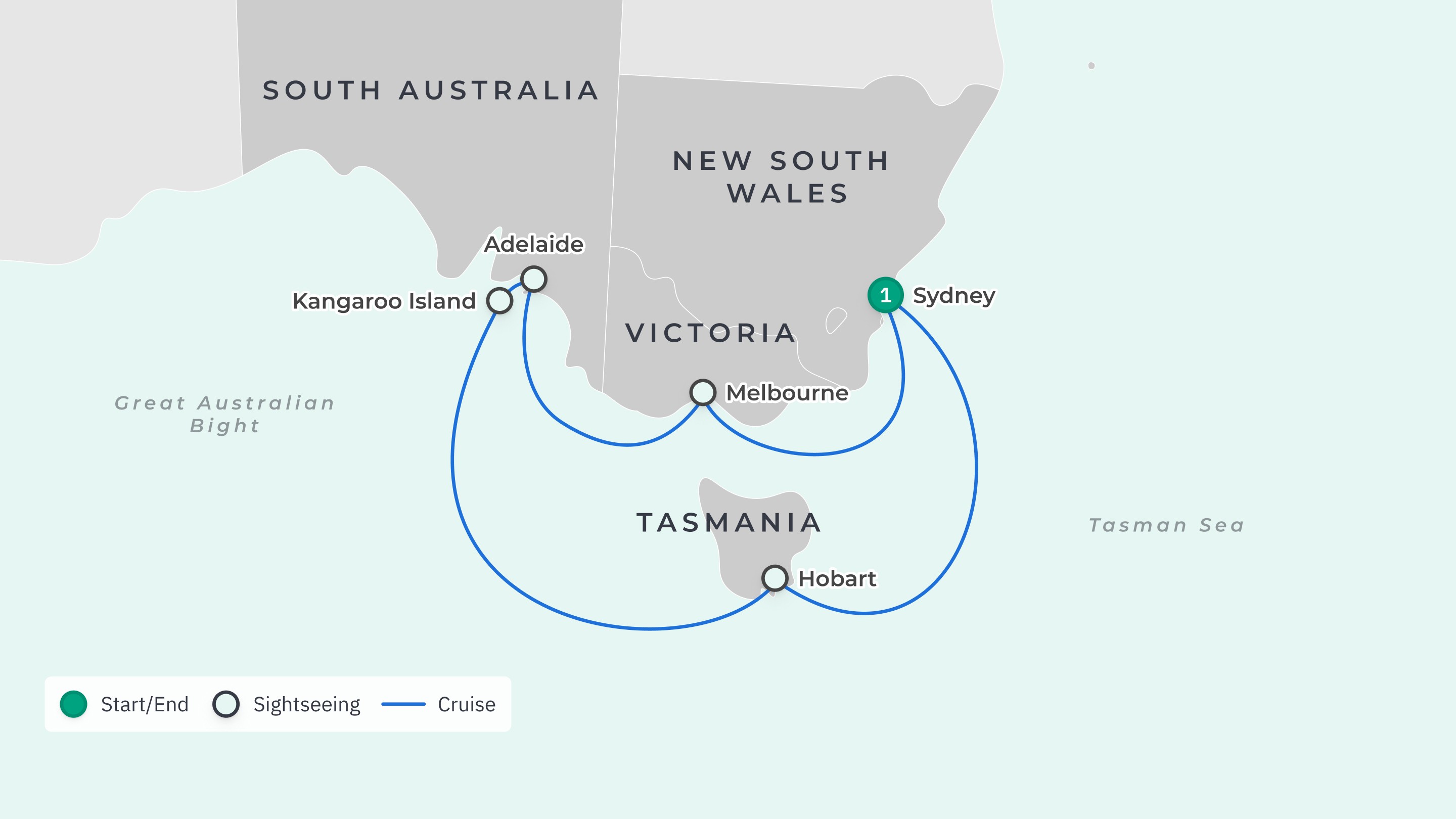 Your journey takes you from Sydney to: Hobart – Kangaroo Island – Adelaide – Melbourne – Sydney.