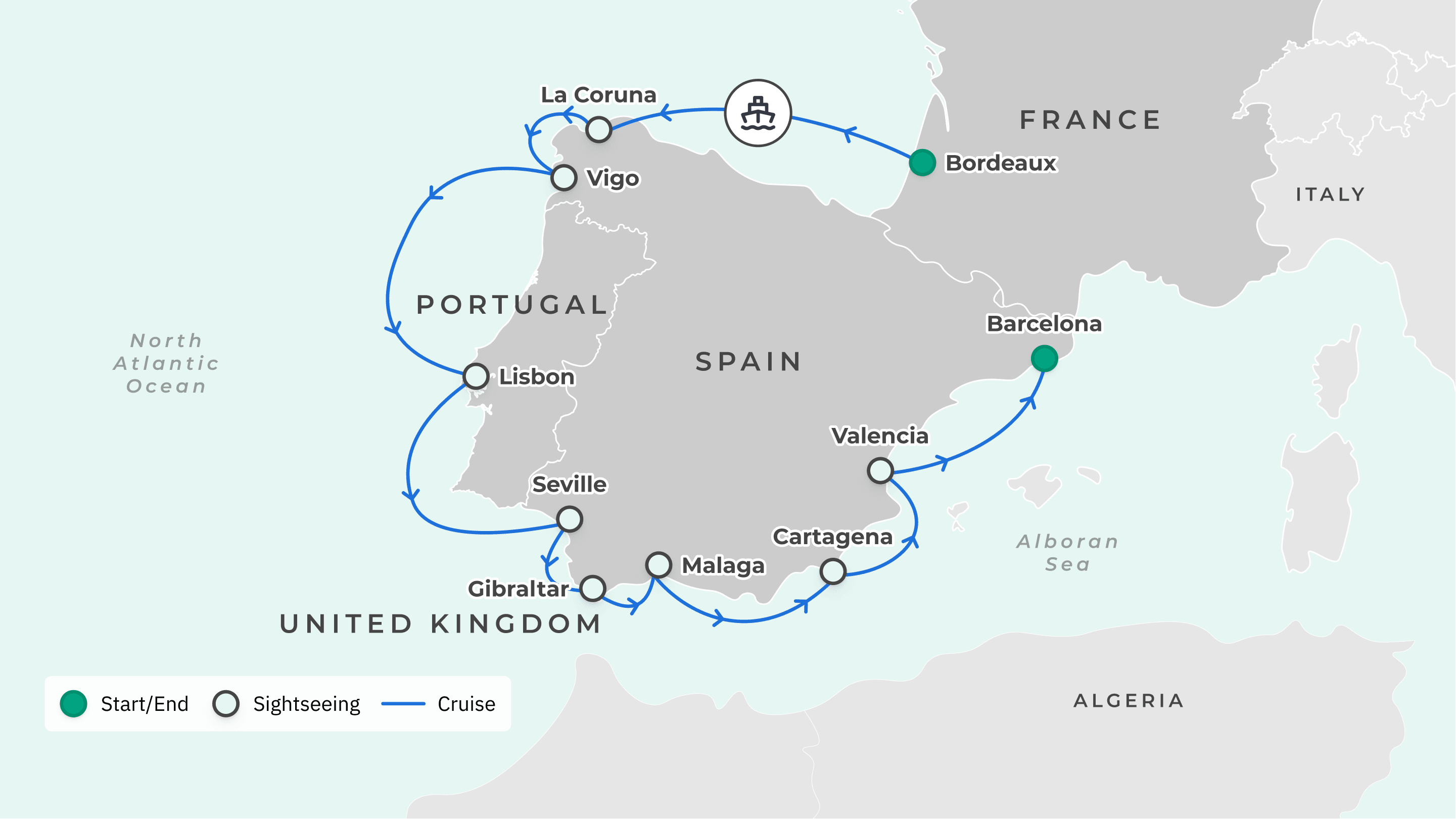 Your journey takes you to: Bordeaux, France – La Coruna, Spain – Vigo, Spain – Lisbon, Portugal – Seville, Spain – Gibraltar – Malaga, Spain – Cartagena, Spain – Valencia, Spain – Barcelona, Spain.