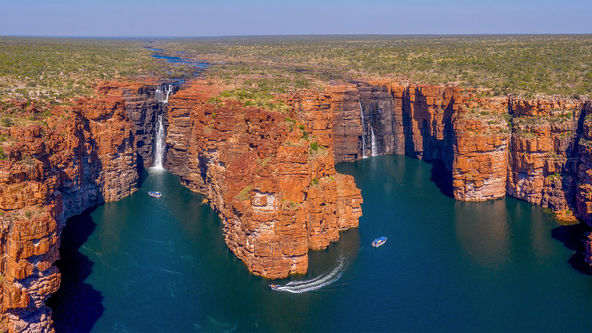 Cruise through the 400-million-year-old gorges of King George River to discover the 80-metre-tall King George Falls, the most impressive waterfall in the Kimberley and the highest twin falls in Western Australia. The King George River plunges over ancient sandstone cliffs into tidal waters, creating this world-renowned sight. Early in the waterfall season, you may cruise around the base of the fall, while in later months, you may view the honeycomb erosion patterns of the sandstone cliffs up close.