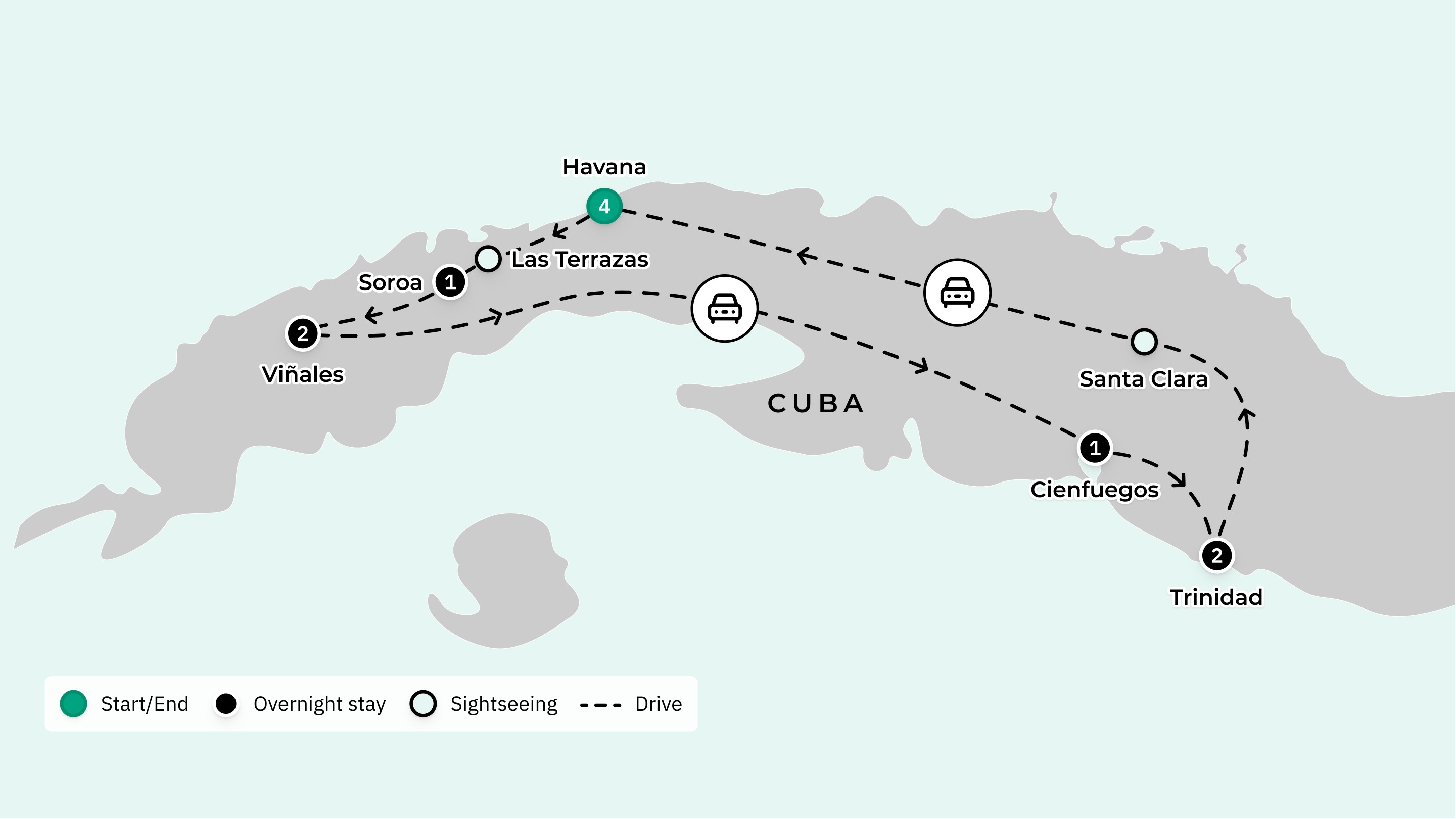 Your journey takes you to: Havana — Las Terrazas – Soroa – Vinales – Cienfuegos – Trinidad – Havana.