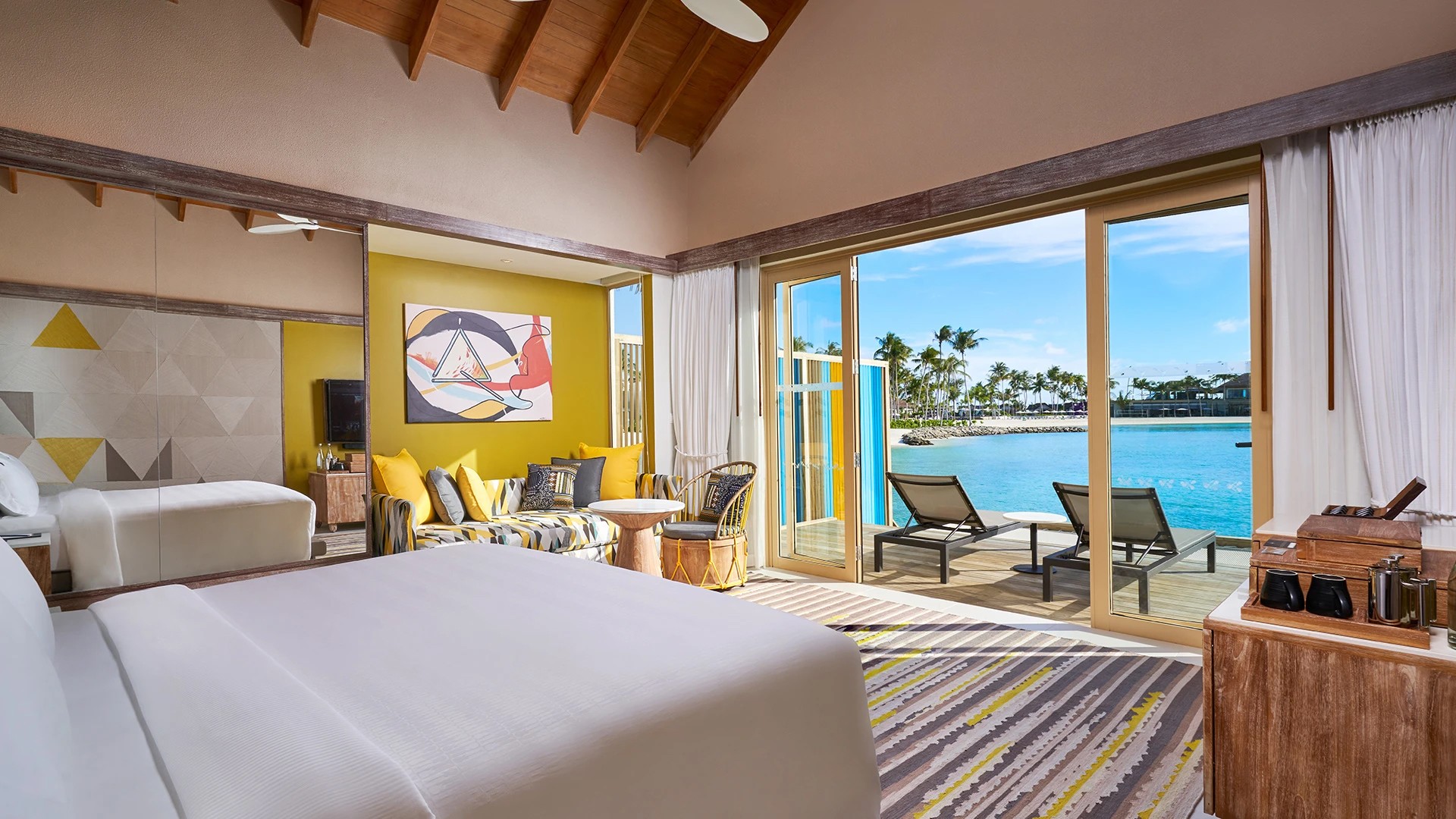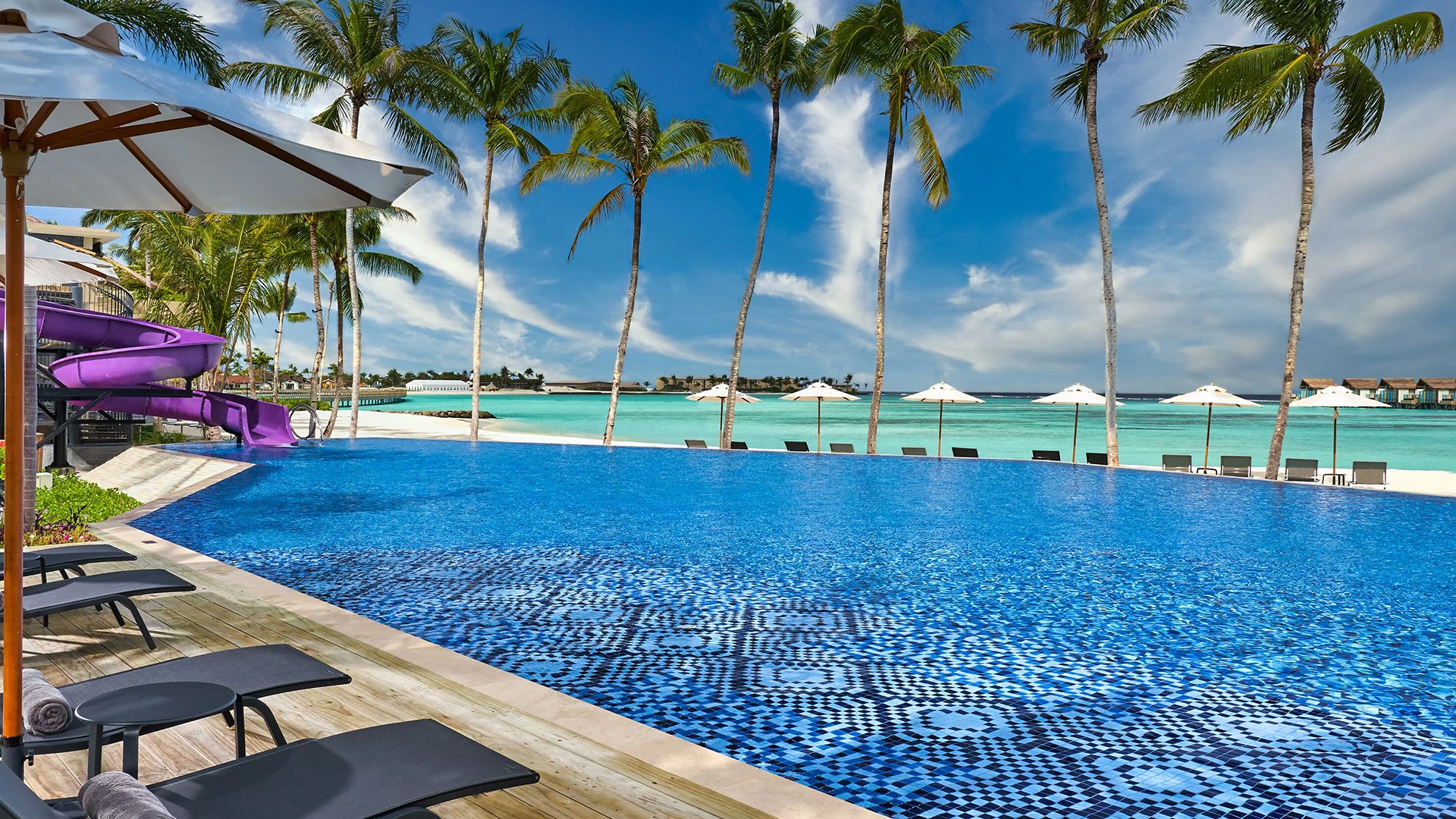 Hard Rock Maldives offers much more than your average resort. As you cross the bridge over the azure waters of Emboodhoo Lagoon from the main marina to the resort island, you’ll be greeted by the sight of palm trees swaying in the breeze and tropical villas dotting the water. Check in at reception, change into your swimming costume, hop down the waterslide and check out the pool bar – you’ve officially arrived in paradise.