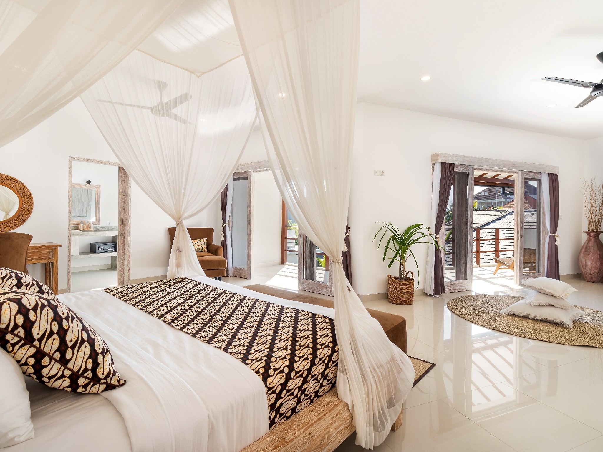 Located in the tranquil enclave of Batu Belig, experience the epitome of Balinese luxury at Hiburan Villas, a secluded sanctuary comprising two self-contained villas. When booked together, the estate boasts two private swimming pools, a jacuzzi, two spacious open-plan living areas and a total of seven air-conditioned bedrooms.