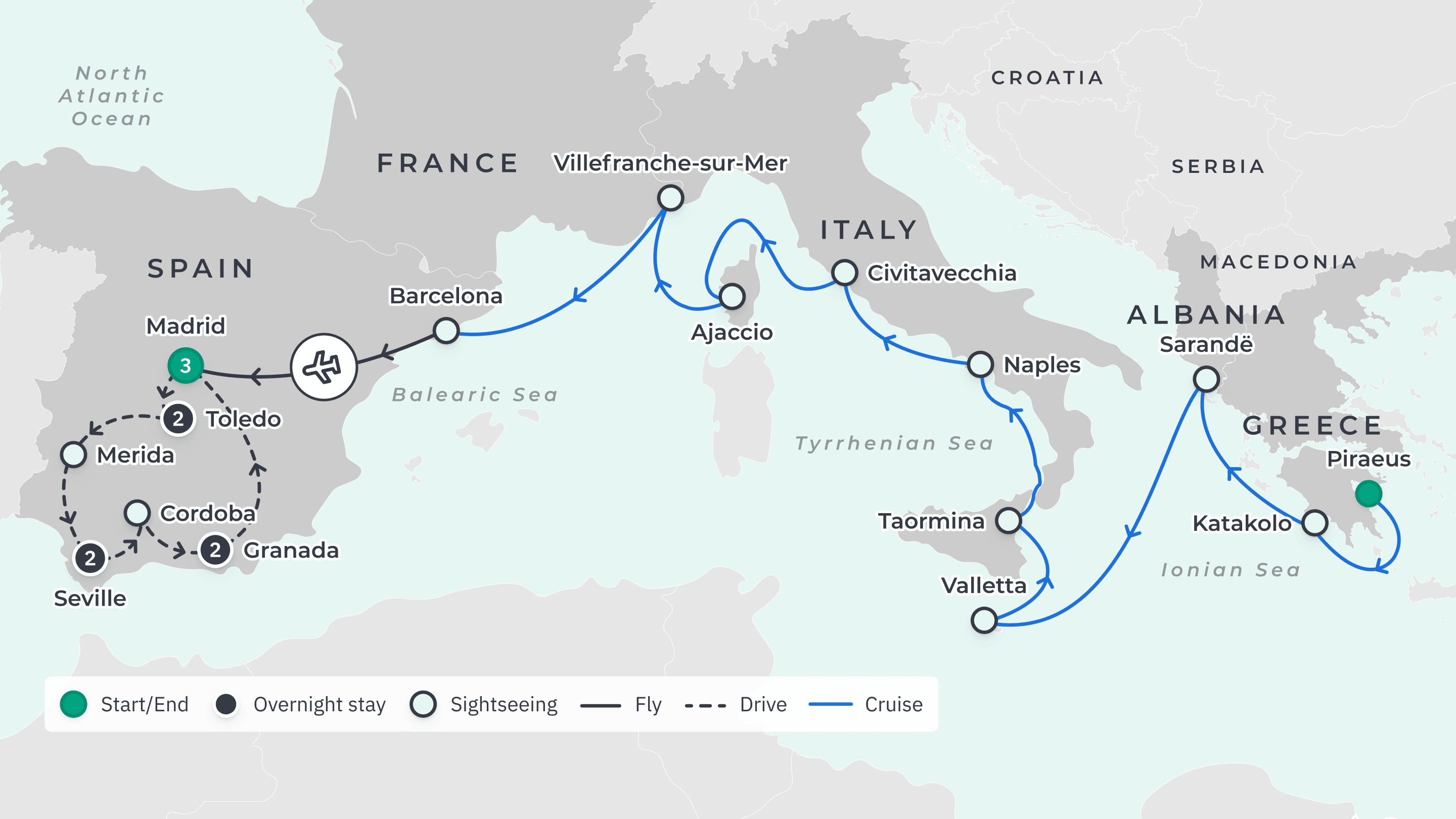 Your journey takes you to: Athens, Greece — Olympia — Sarande, Albania — Valletta, Malta — Taormina, Italy — Naples — Rome — Ajaccio, France — Nice — Barcelona, Spain — Madrid – Merida – Seville – Cordoba – Granada – Toledo – Madrid.
