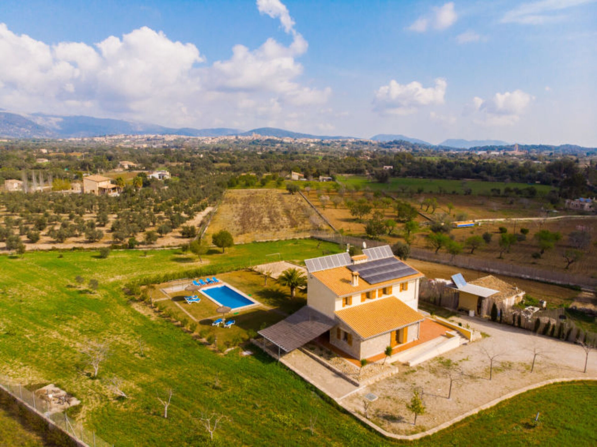 \*\*5 Star Villa Holidays is proud to present Mallorca Villa 1288.\*\* “Mallorca Villa 1288”, 5-room house 224 m2 on 2 levels. Object suitable for 8 adults. Spacious, comfortable and cosy furnishings: 1 double bedroom with 1 french bed (160 cm, length 200 cm), satellite TV, flat screen and fan. Exit to the patio, to the swimming pool. Open large living/dining room with panoramic window with dining table, satellite TV, digital TV, flat screen and wood-burning stove. Exit to the patio, to the swimming pool. Open kitchen (4 hot plates, oven, dishwasher, toaster, microwave, freezer, electric coffee machine). Exit to the patio, to the swimming pool. Upper floor: 1 large double bedroom with 2 beds (90 cm, length 190 cm), satellite TV, flat screen and fan. 1 large double bedroom with 1 double bed (160 cm, length 200 cm), satellite TV, flat screen and fan. 1 large double bedroom with 2 beds (90 cm, length 190 cm), satellite TV, flat screen and fan. Large patio, lawn, porch. Terrace furniture, barbecue, deck chairs (8), covered balcony, sitting area. Marvellous panoramic view of the mountains, the swimming pool, the garden and the countryside. Facilities: washing machine, iron, children’s high chair, baby cot for up to 2 year olds, hair dryer. Internet (WiFi, free). Please note: non-smoking house. Mallorca Villa 1288 Moscari: Very large, beautiful farm estate “Mallorca Villa 1288”, surrounded by trees, meadows and fields. Outside the resort Moscari, in a quiet, sunny position, in the countryside. Private: natural state property with lawn, lawn for sunbathing, beautiful garden to relax, swimming pool angular (4 x 10 m, depth 100 - 200 cm, 01.01.-31.12.). Outdoor shower, table tennis, patio, arbour, pergola, garden furniture, barbecue, pool maintenance by the owner/gardener. In the house: internet access, WiFi, central heating system, washing machine. Parking at the house on the premises. Shop 4 km, grocery 4 km, bar 4 km, bakery 4 km, café 4 km, internet café 4 km, pub garden 4 km, sandy beach “Playa de Alcudia” 20 km, shingle beach “Playa de Aucanada” 22 km. Hiking paths: Fonts Ufanes 6 km. Please note: car recommended. Baby equipment on request (included). Object suitable for 8 adults. The owner does not accept any youth groups. On the estate animal husbandry. Loading and unloading of baggage is possible at the holiday house. Airfield 48 km from the property.