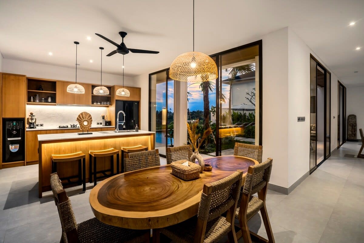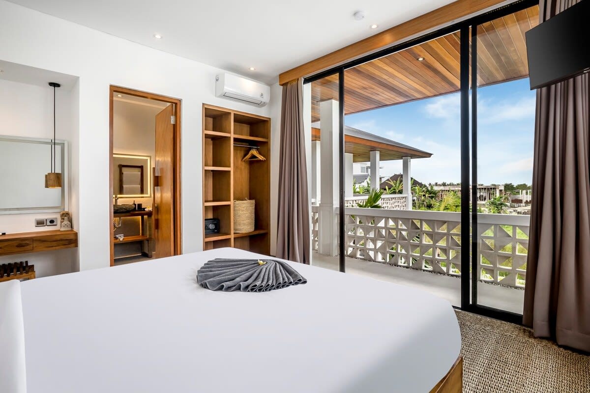 Set in Bali’s laidback Pererenan, this four-bedroom, two-level villa pairs open-air living with lush green outlooks. An open-plan design flows to a terrace framing an L-shaped infinity pool, with loungers and a private parking space onsite. Natural ventilation is prioritised throughout, with locally made Sensatia Botanicals amenities in each bathroom.