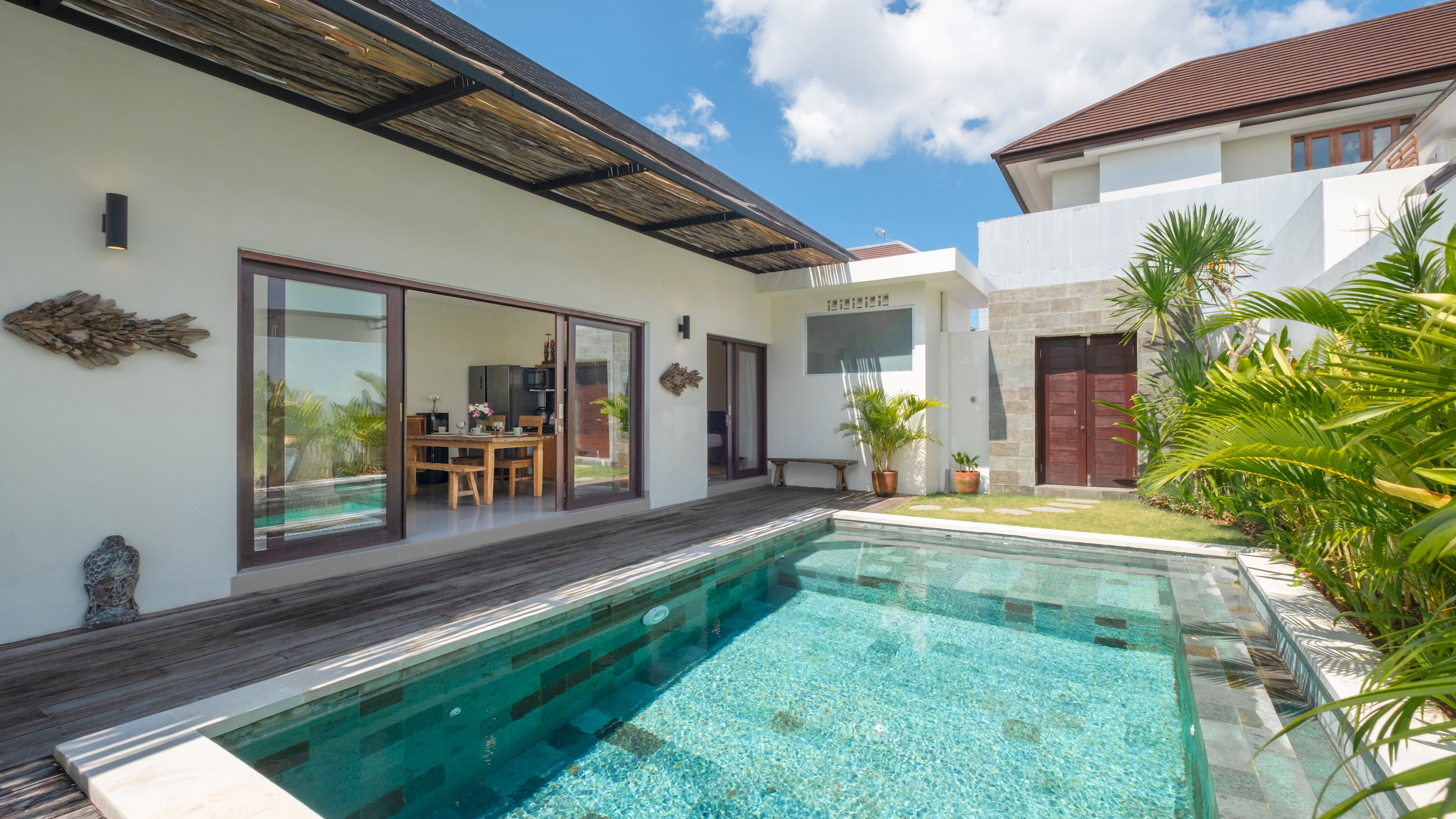 Each spacious bedroom is thoughtfully designed to maximise comfort, featuring plush king-sized beds, high ceilings, and soft lighting that creates a warm, inviting atmosphere. Traditional Balinese aesthetics are beautifully interwoven with modern design elements, offering guests a unique and comfortable experience. Wake up to views of the verdant garden and sparkling pool, savouring the breathtaking scenery from the comfort of your room.