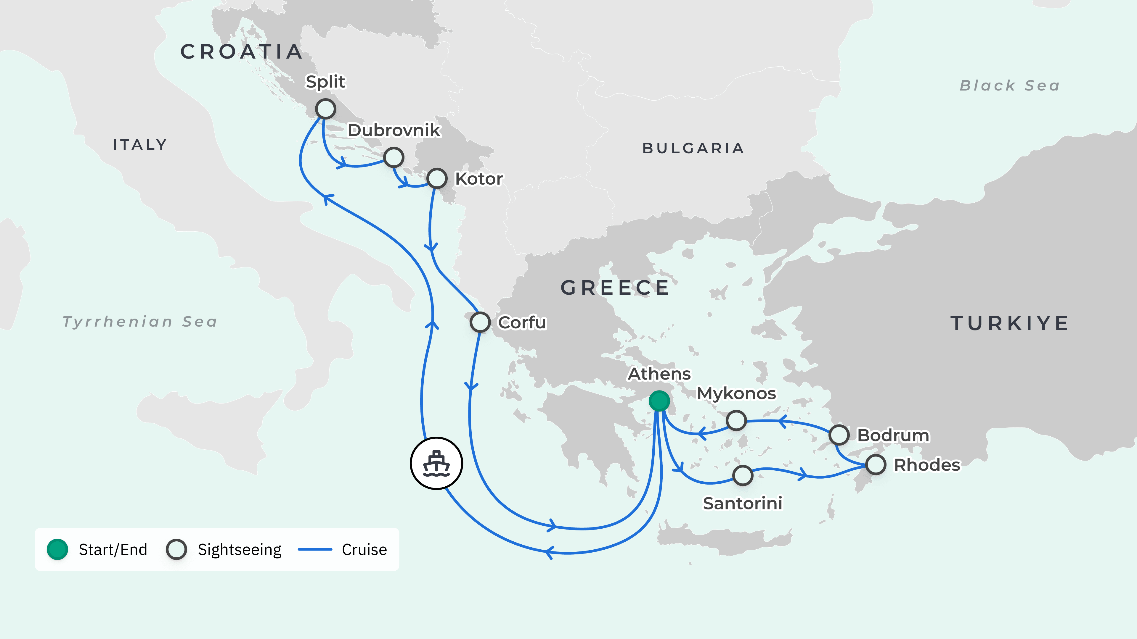 Your journey takes you from Australia to: Athens (Piraeus), Greece – Santorini – Rhodes – Bodrum, Turkiye – Mykonos, Greece – Athens – Split, Croatia – Dubrovnik – Kotor, Montenegro – Corfu, Greece – Athens – Australia.