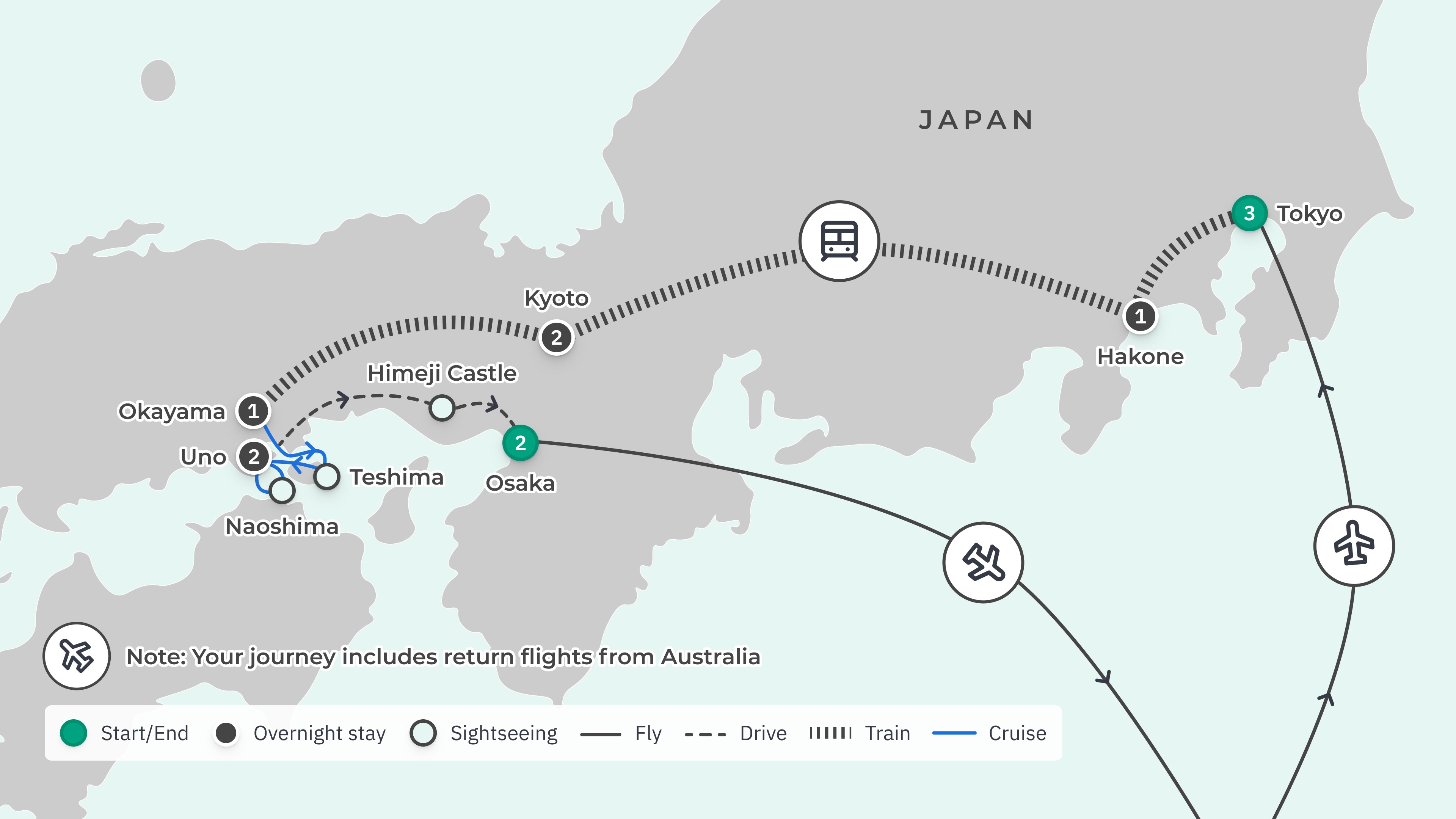 Following breakfast, part ways with your fellow travellers as your immersive exploration of Japanese art, culture and design concludes. Transfer to Kansai International Airport (KIX) for your onwards journey.