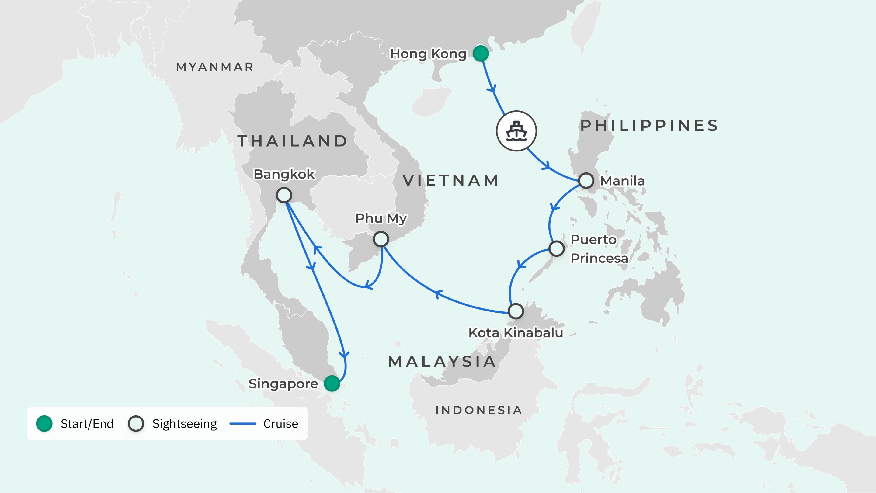 Your cruise begins in Hong Kong and ends in Singapore.