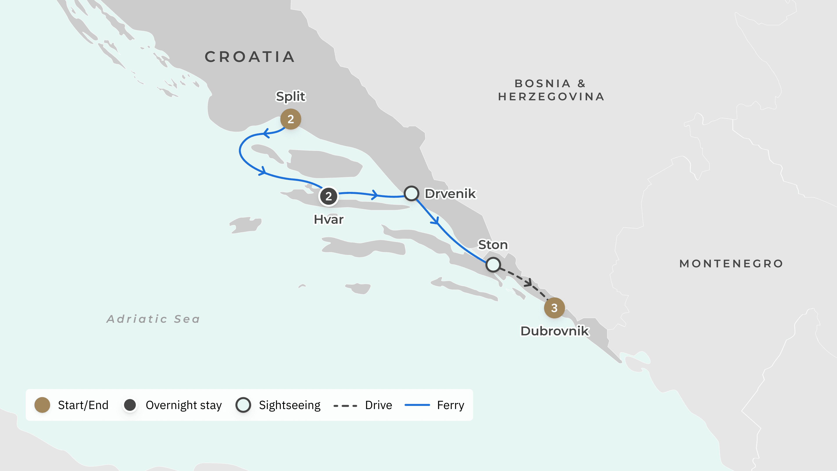 Your journey takes you to: Split – Drvenik – Hvar – Ston – Dubrovnik – Konavle – Dubrovnik.