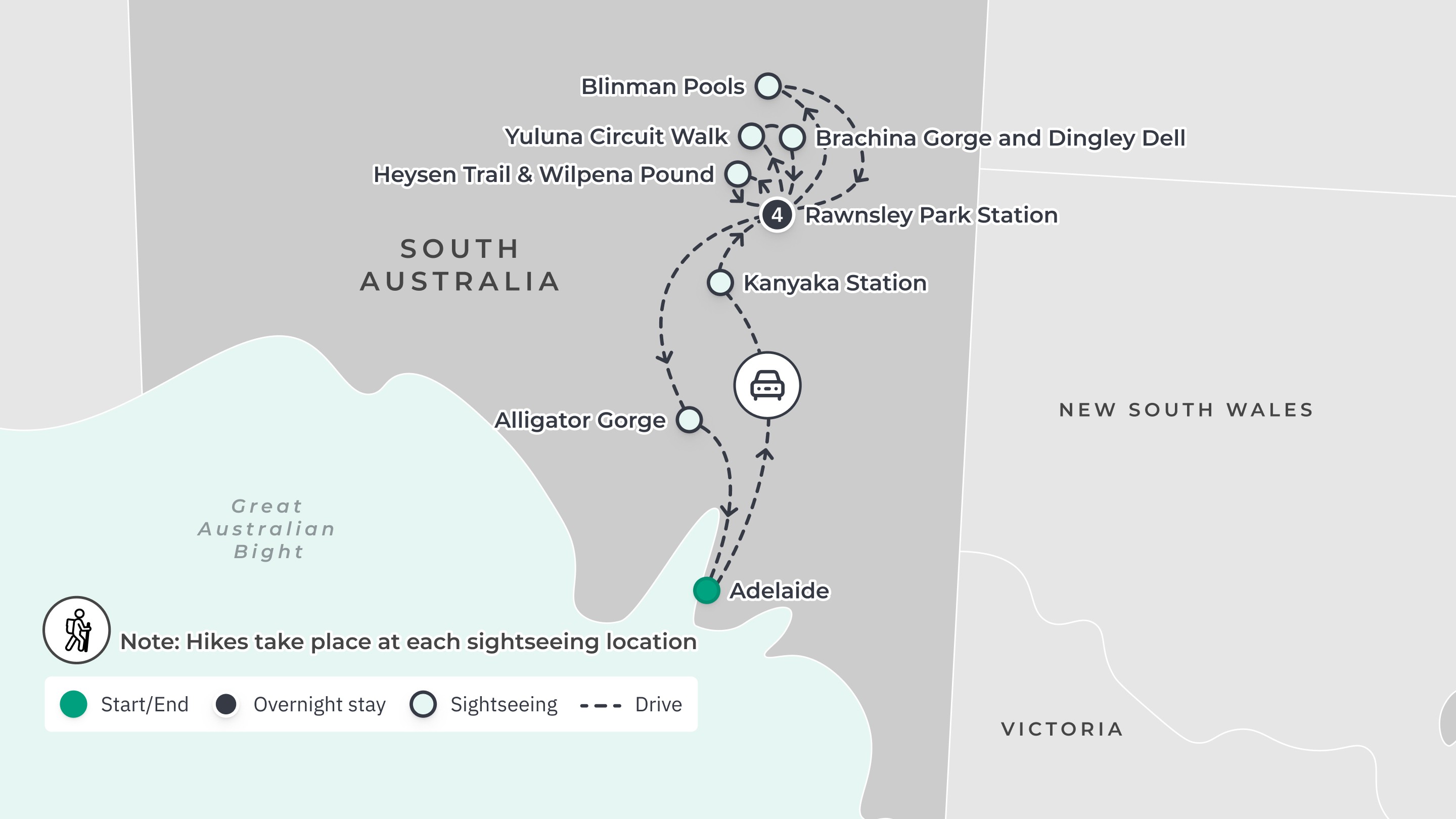 Here, your hiking adventure concludes and you’ll be able to make your own way to your Adelaide post-tour accommodation or onward travels.