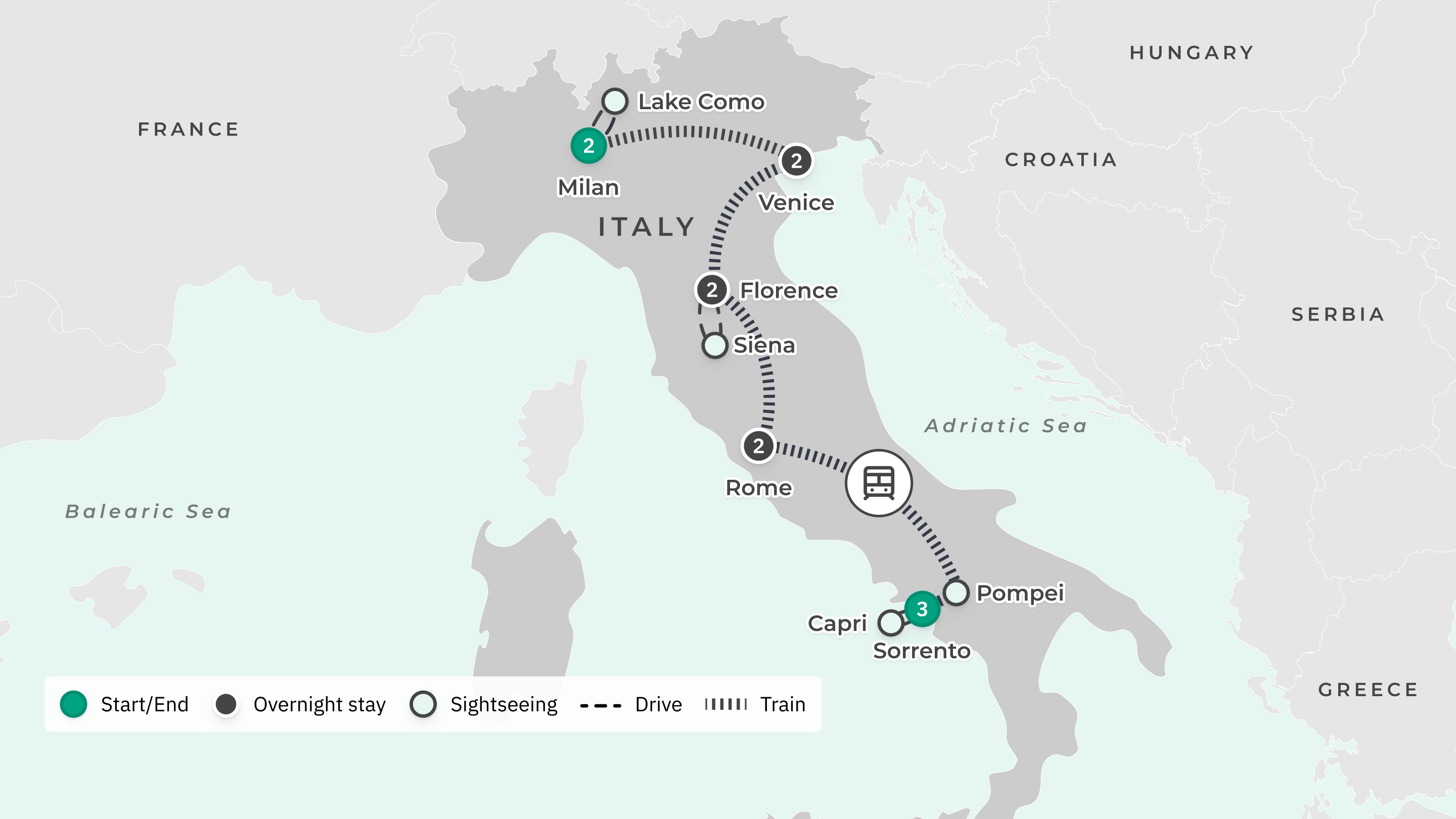 Your journey takes you to: Milan, Italy – Lake Como – Bellagio – Milan Venice – Florence – Siena – Florence – Rome – Naples – Pompeii – Sorrento – Capri – Sorrento.