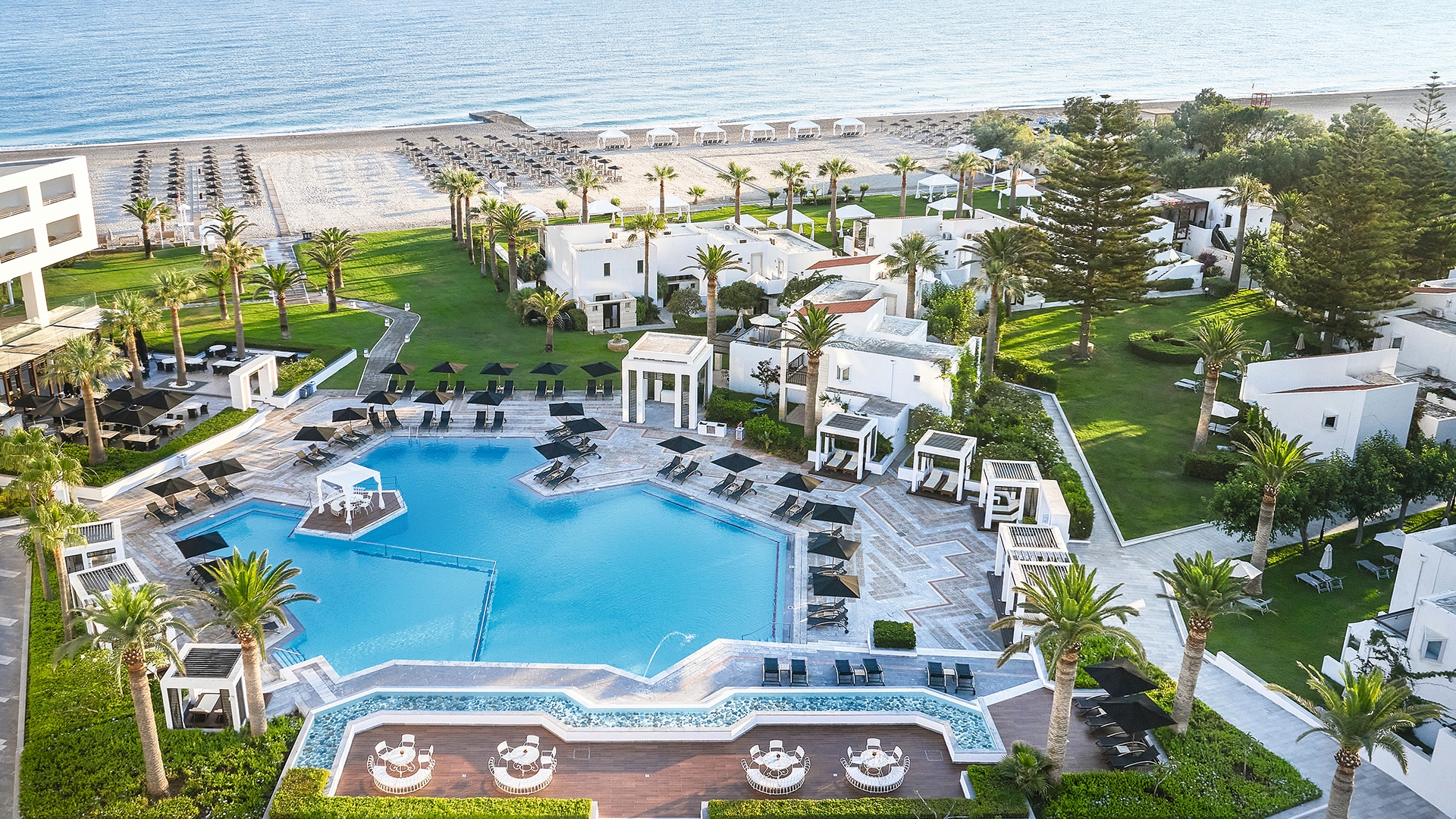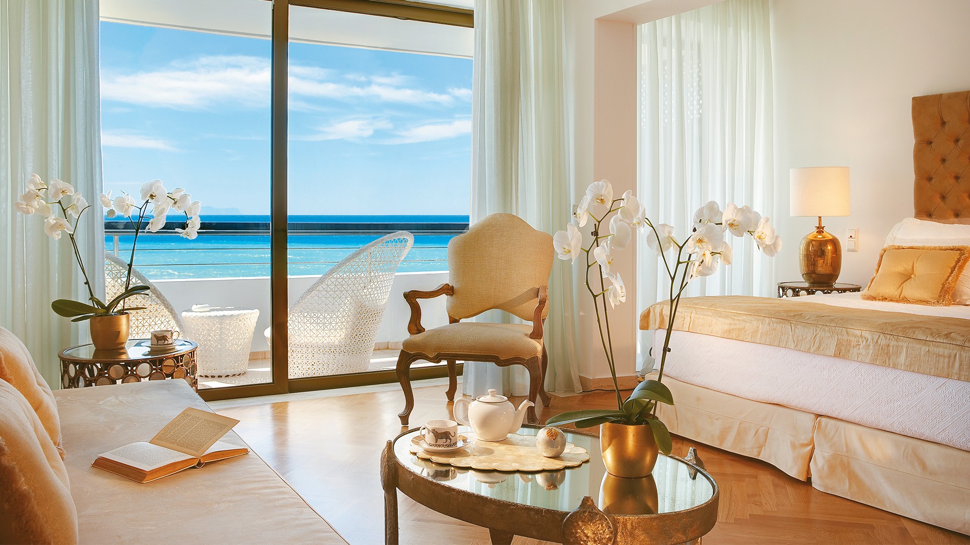 Embrace sophisticated Greek hospitality at the five-star Grecotel Creta Palace, located on a stretch of Crete’s silky-white sand. With the turquoise ocean on its doorstep, this magnificent resort is a sunshine-filled paradise boasting traditional whitewashed buildings made to mimic a Greek island town – complete with a village square, a church and an authentic cafe – alongside verdant gardens and glistening pools. Spend hours exploring this haven, with fun-in-the-sun activities perfect for families seeking a relaxing getaway. Little ones can splash in the children’s pool or race down the waterslides while adults indulge at one of the nine onsite eateries and bars.