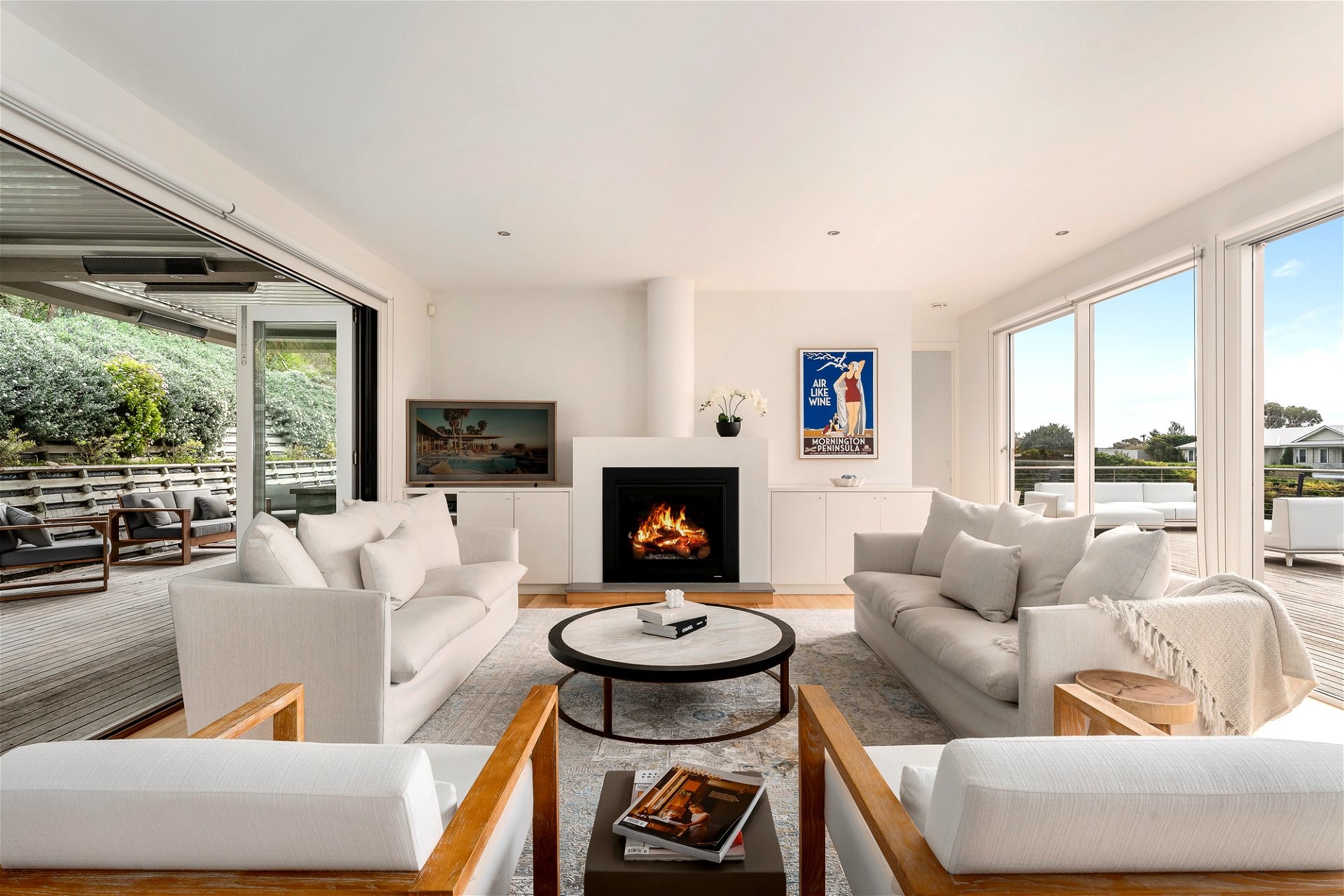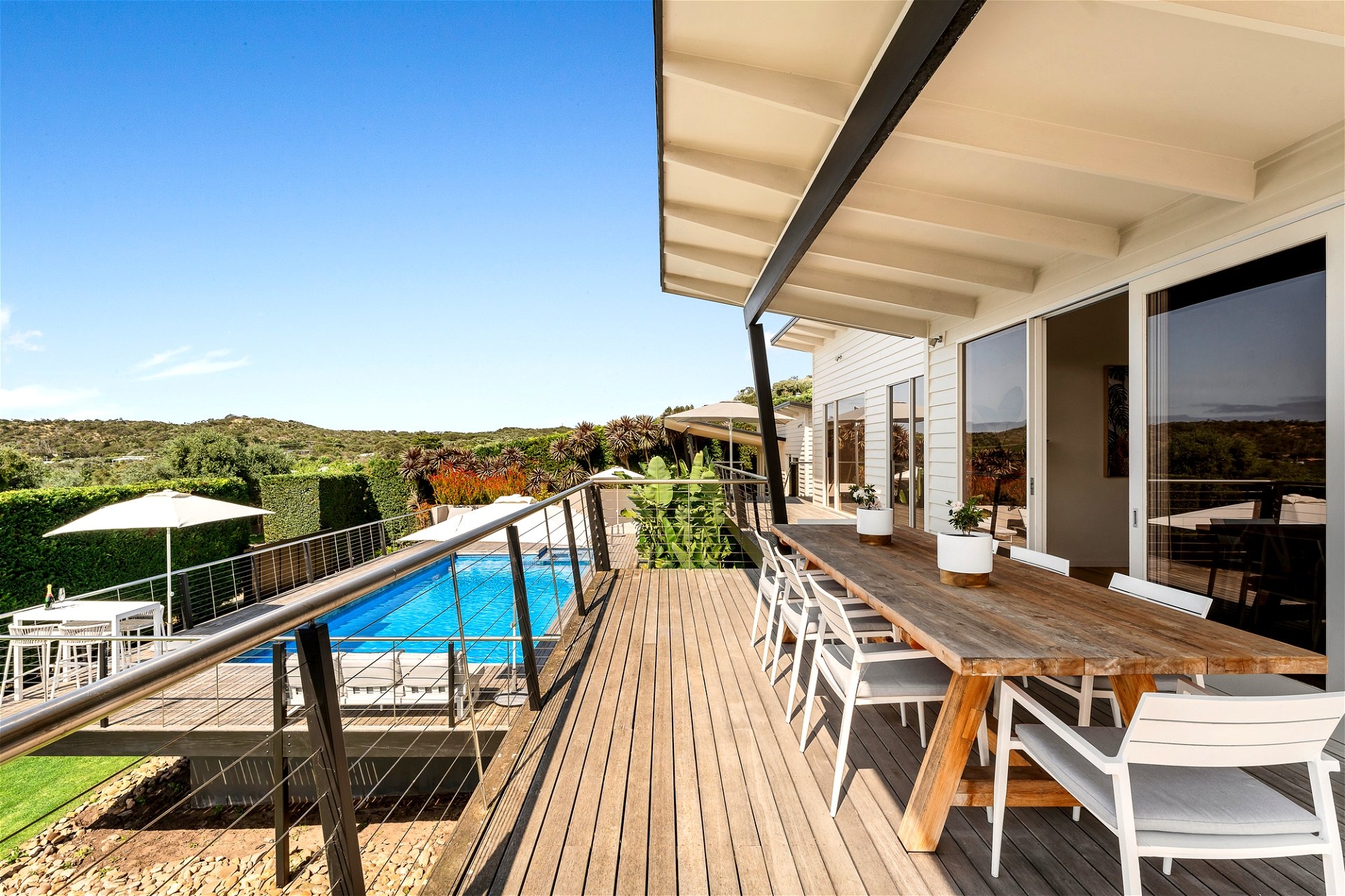This 5-bedroom family home with heated pool and stunning views is a beautiful coastal property located in Portsea on the Mornington Peninsula, known for its stunning beaches and scenic coastline. Ideal for both intimate family living and grand-scale entertaining, it has luxurious and comfortable indoor-outdoor living spaces and access to bay and ocean beaches. It’s just minutes away from Sorrento and Portsea offering easy access to all the attractions and experiences of the Mornington Peninsula. With 5 bedrooms and 3 bathrooms, Ocean Mist has been designed to enhance its coastal location giving you and your guests ample space to entertain or simply unwind and relax. This home is perfect for families or groups who appreciate their own space yet want to enjoy quality time and create shared memories. Enjoy your morning coffee on the oversized deck, accessible from each of the separate wings. This is the space you’ll find hard to leave as you soak up the sunshine and enjoy the ocean breeze. Kick back with a book or take a dip in the resort-style swimming pool and spa – you’ll enjoy complete relaxation if this is what you choose. For entertainers, this home is the place to bring loved ones together. The wonderfully equipped kitchen flows to a light-filled open-plan living and dining area – the perfect space to host an intimate dinner party. For larger gatherings, the alfresco deck is the place to wine and dine, in the sunshine or under the stars. There is a rumpus room with a TV and kitchenette, giving the kids and teenagers their own space to enjoy. Located in separate wings, the bedrooms offer privacy and quiet. The Master with King bedroom includes an ensuite and walk-in robe with floor-to-ceiling windows opening onto the deck. There’s no better way to start the day than a cup of tea or coffee in the sunshine as you hear the ocean waves. The remaining four with Queen bedrooms all offer a calm aesthetic, walk-in robes, and direct access to the deck. There is a large home office with external access, dual driveway access, an alarm system, ducted heating, air conditioning, laundry, plenty of parking, and ample storage throughout. Ocean Mist will give you a luxurious and comfortable experience where you can enjoy upscale living with the natural beauty of the surrounding area. Area Located in a highly sought-after no-through road between bay and ocean beaches, just minutes to the townships of Sorrento and Portsea, this property offers easy access to award-winning attractions of the Mornington Peninsula. Swim or surf at the popular Portsea Beach and Sorrento Back Beach or enjoy a hike through Point Nepean National Park or the coastal trail of Millionaire’s Walk with spectacular ocean views. Portsea Pier is a popular fishing spot but if you prefer to have your dinner cooked for you, the Portsea Hotel is the place to go for waterfront dining with views over Port Philip Bay. The adjacent town of Sorrento is mere minutes away and here you’ll find myriad boutiques, cafes, and restaurants.