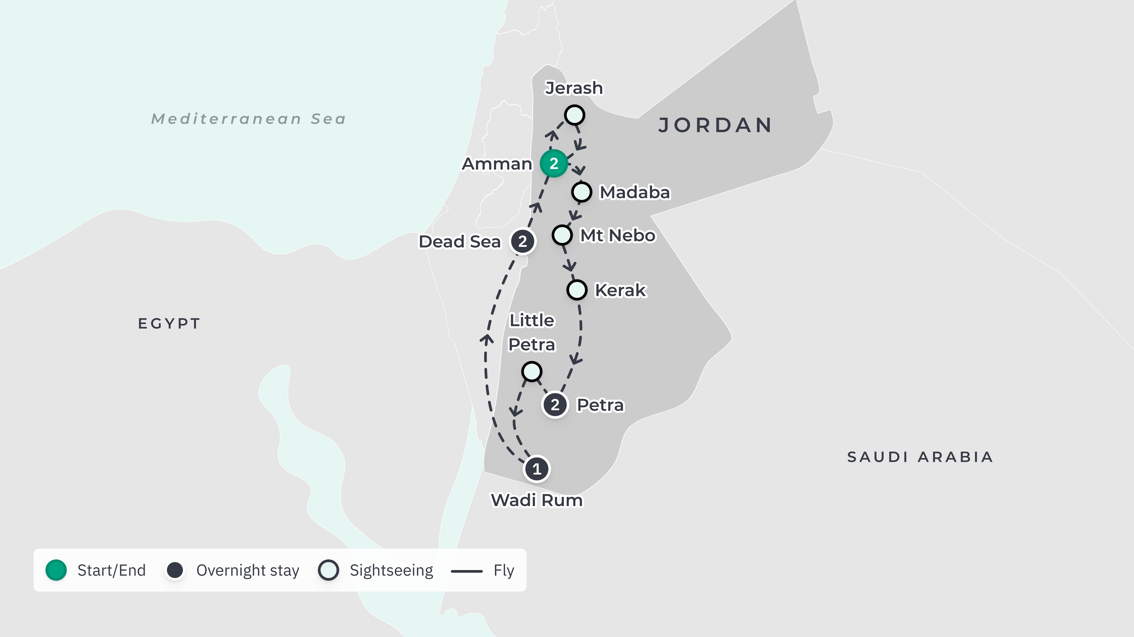 • Checkout on your final day is at 12pm. Please book your flights to depart from Queen Alia International Airport (AMM) at any time. Your transfer will meet you at your hotel and take you to the airport.