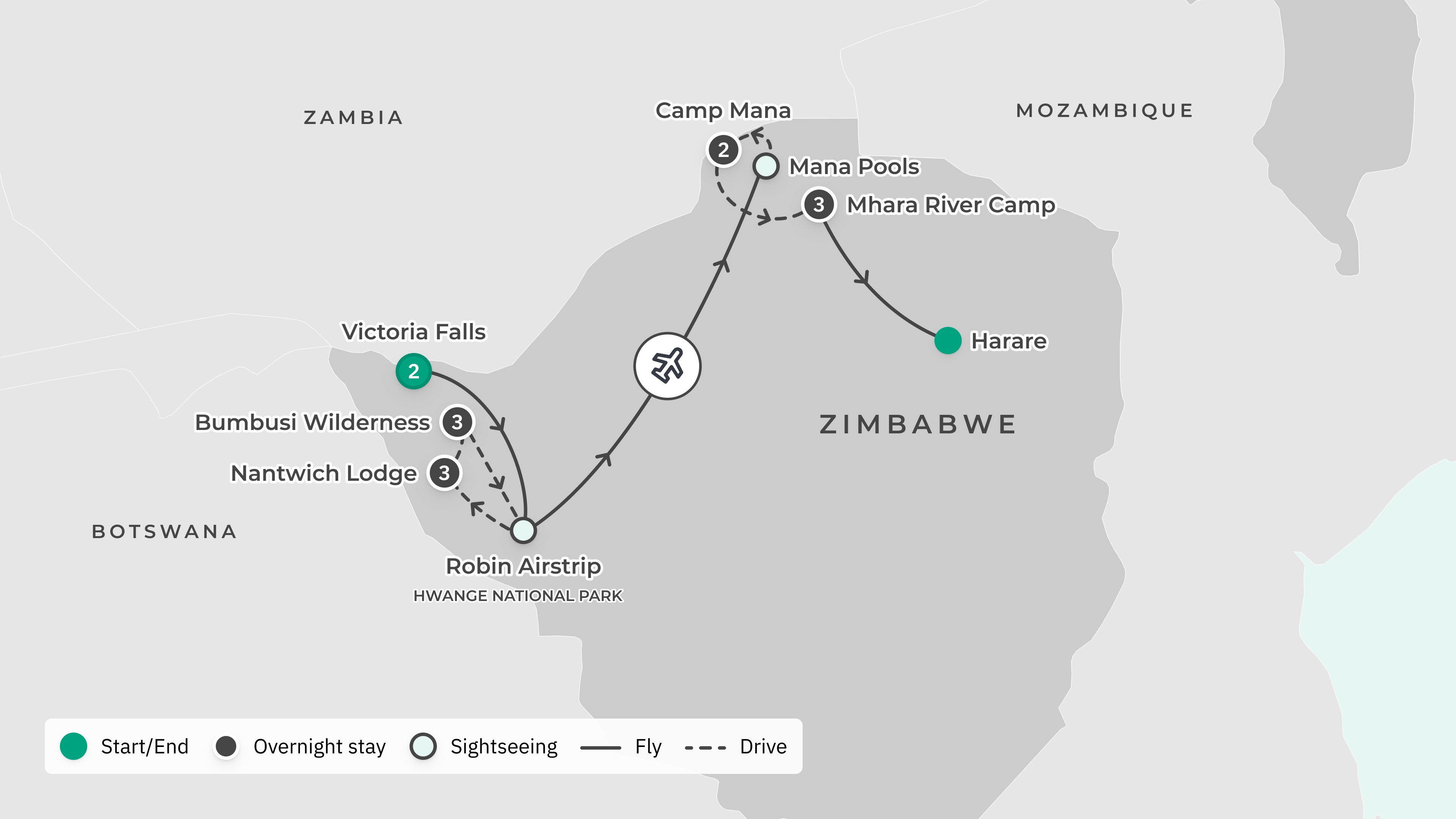This morning, transfer to the Ruckomechi Airstrip for your scenic light aircraft flight to Robert Gabriel Mugabe International Airport (HRE), where your journey comes to an end.