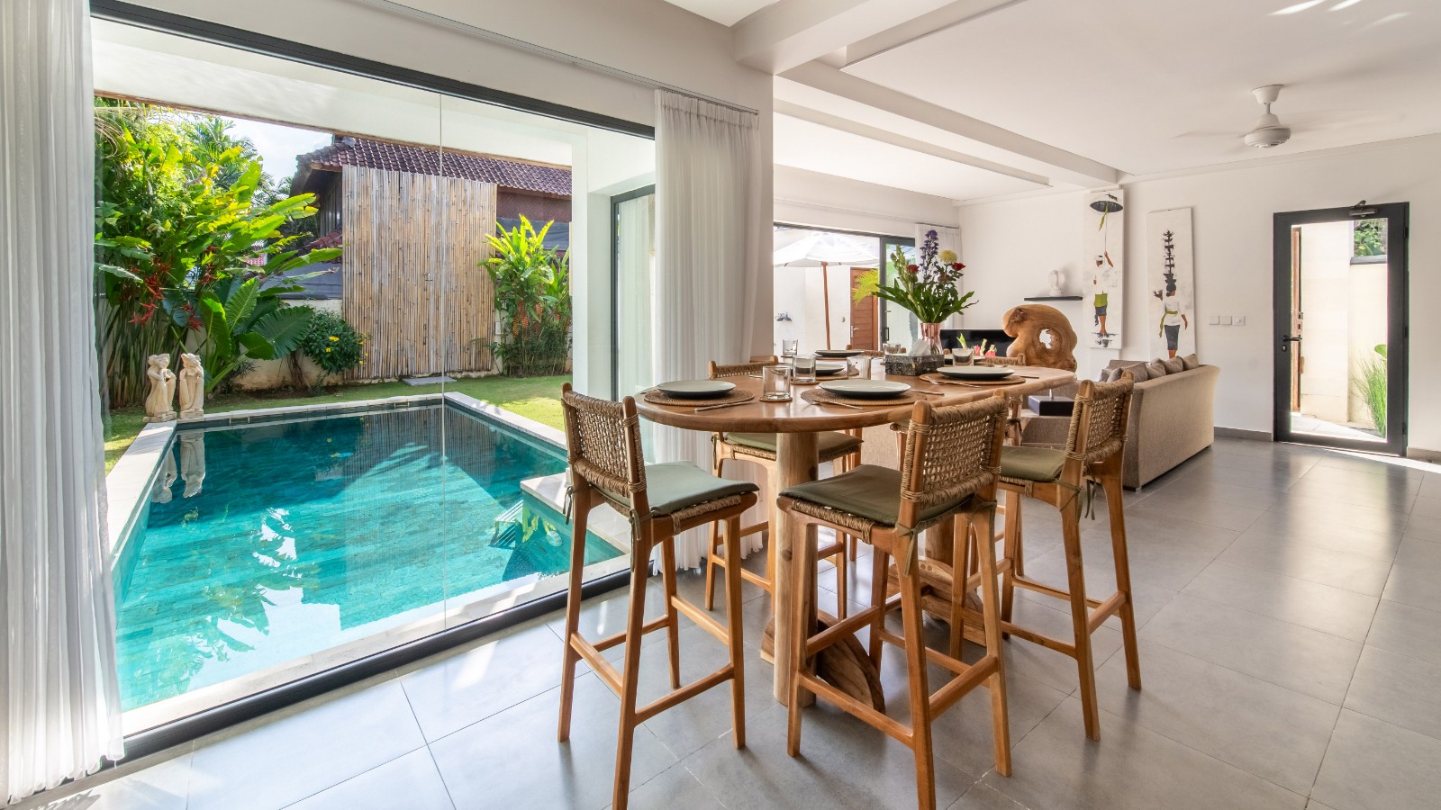 Villa Wiana is a contemporary luxury villa with an enviable, super central location in lively and fashionable Seminyak. The perfect holiday home in Bali for a family or a group of close friends. Featuring 3 air-conditioned bedrooms suites, an upper-floor entertainment area in addition to the living space and a sunny private tropical garden with a swimming pool, a stay at Villa Wiana is all about leisure, relaxation and fun. On top of that, the buzzing city centre and the lively beach of Seminyak, await just outside. Villa Wiana houses 3 villa suites, each air-conditioned and fitted with a romantic canopied king-size bed. The rooms are identical in their designs, ruled by chic red colours in the details, tasteful artwork and beautifully folded towels on the beds. Each room has its own private en-suite bathroom fitted with a luxurious rain shower, washbasin and WC. Villa Wiana features a lovely private sunny garden where in a refreshing swimming pool sparkles. In the garden grow leafy palm trees in the manicured green grass lawn. In the corner, there is a sun deck with reclining chairs and beanbags, great for sunbathing and sipping cocktails. The gazebo makes a nice shady spot to snooze a little in the daytime or to get pampered with a Balinese massage. The downstairs combined living and dining room enjoys direct pool access when all of the floor-to-ceiling glass doors are opened up the garden. It creates a wonderful, tropical open-plan living space for those who like to experience the exotic lifestyle. On one side of the living area, there are 3 round-shaped rattan relax chairs placed around a coffee table. This is a nice place to sit alone or with friends, reading a book, enjoying the garden view or watching some television. On the other side stands a gorgeous teak wooden-carved dining table for 10 guests to enjoy some good wine and food together and in the back, there is a fully-equipped western kitchen for you comfort and convenience. Upstairs, there is a whole second living room designed for your entertainment. Come up here to play a game of billiard or get comfy on one of the sofas, facing a huge flat-screen TV for an in-house cinema experience. The location of Villa Wiana is just perfect. Tucked away in the quiet gangs in the Drupadi area of Seminyak, Double Six Beach and all of its sunset beach bars are just a short stroll away. There are lots of local cafes, spas and shops around. If you feel like splurging, the chic and trendy Oberoi district of Seminyak, home to the famous Eat Street and KU DE TA beach club, is also within walking distance of the villa.