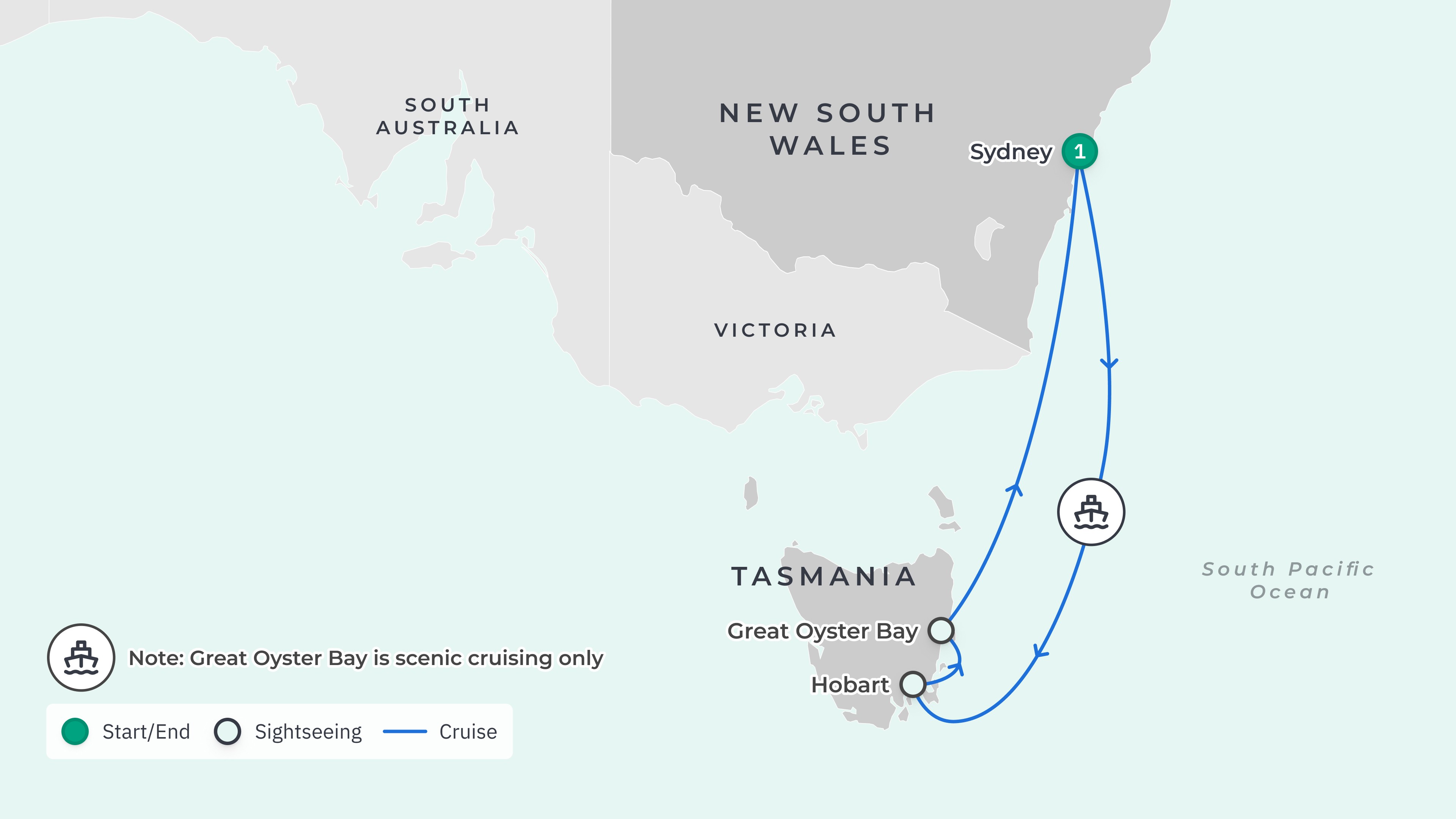Your journey takes you to: Sydney – Hobart – Great Oyster Bay (scenic cruising) – Sydney.