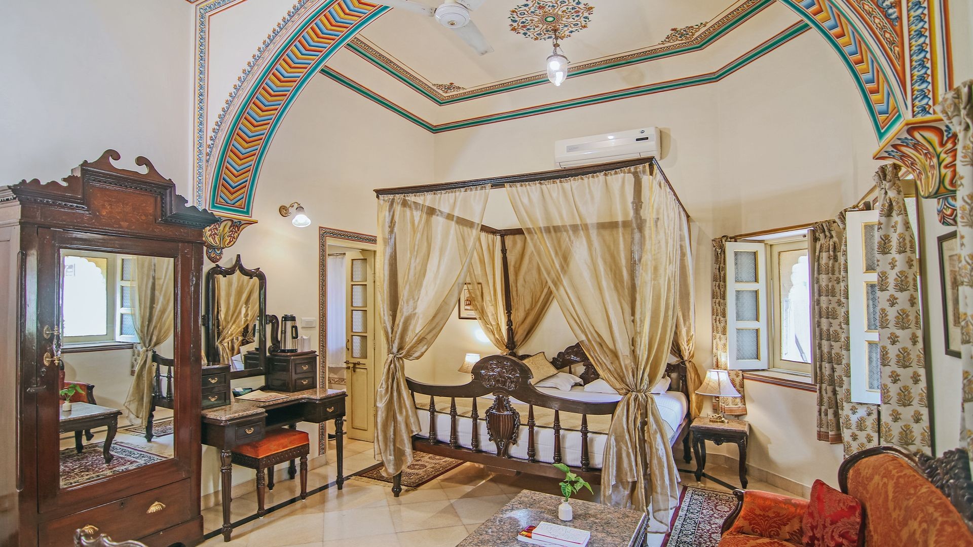 A royal room featuring a beautiful blend of traditional Rajput architecture and contemporary comforts, along with antique furniture, a carved four-poster bed and rich furnishings