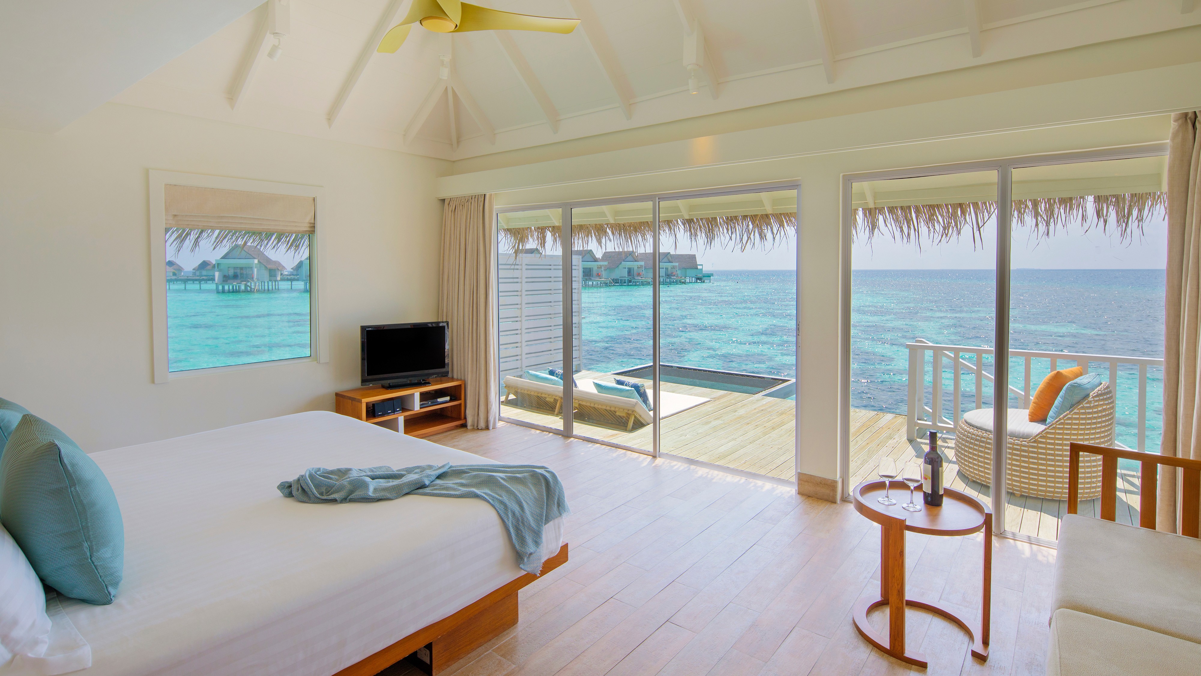 Signature offerings include a Kids’ Club with separate zones for little ones and teens, spectacular dining options, a Club Lounge with dedicated concierge service and the luxurious SPA Cenvaree. You’ll also find a range of dining options, bars and lounges with nightly entertainment. Foodies will enjoy wandering along overwater walkways to their choice of restaurant – Reef, situated next to the infinity-edge swimming pool, offers teppanyaki and an international buffet; Mare Azurro sees seafood and Italian perfectly matched with picture-perfect views of the lagoon, and Suan Bua, home to plates of tempting Thai favourites. Nurse a drink at Aqua Bar as traditional Maldivian music provides the perfect backdrop to a stunning ocean sunset.