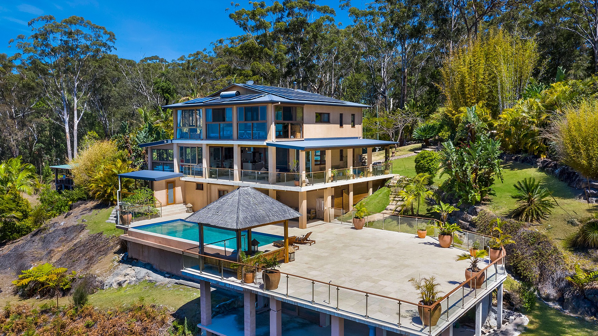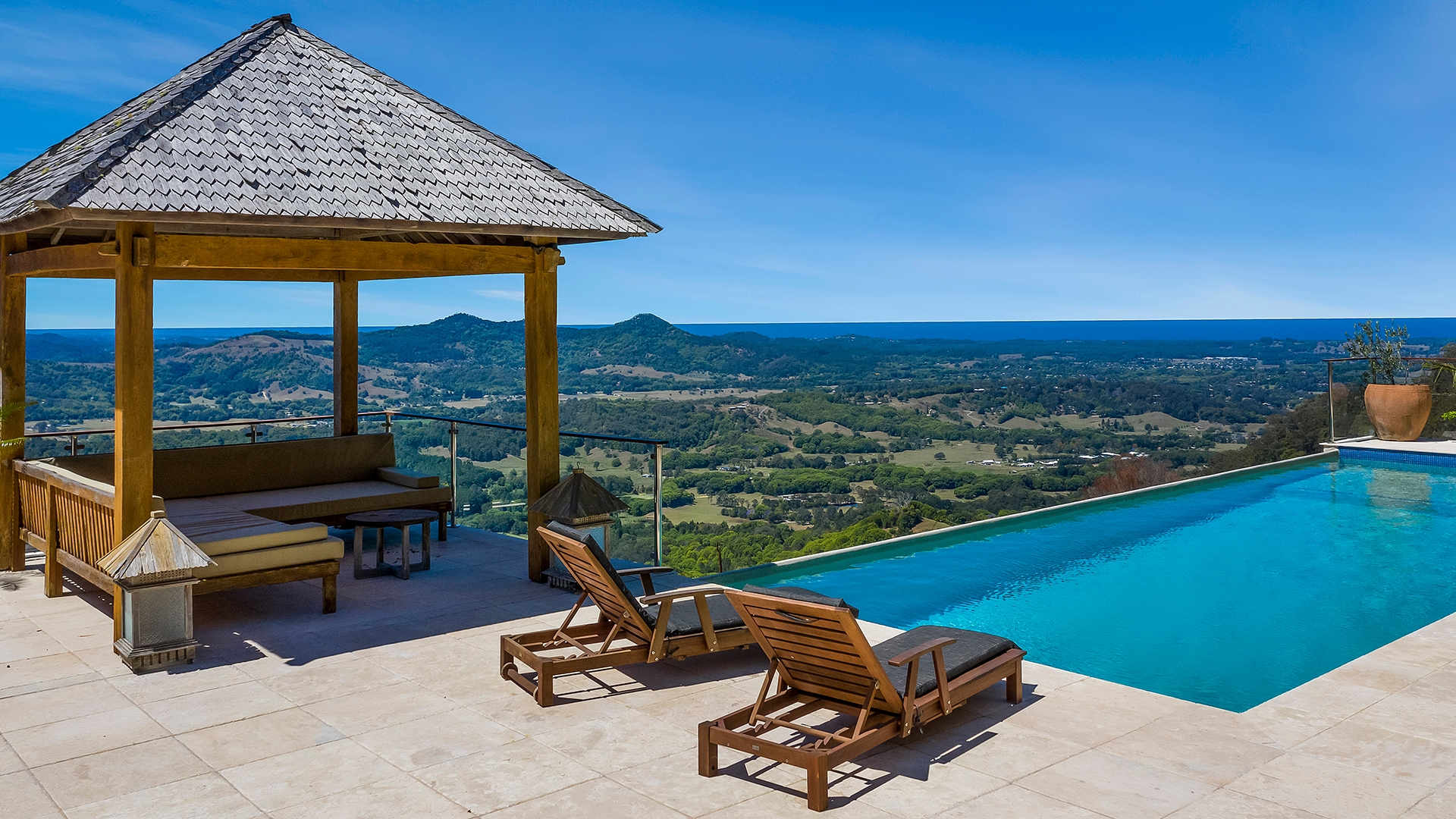 Bask in the spectacular view of the Koonyum Range at this spacious villa, located on the edge of a cliff only a short drive away from Byron Bay and Mullumbimby. Nestled amid lush eucalyptus with panoramic ocean views, this private property for up to 10 guests ensures complete seclusion for you and your travel companions. The outdoor space is simply stunning, offering seemingly endless views of the hinterland and ocean beyond. Soak up the striking vistas from your infinity pool, tropical cabana, sun lounger-dotted terrace, spa pool or one of the many balconies. Cook up a feast on the BBQ and enjoy some of the region’s delicious local produce. Or, get together and enjoy the fabulous group facilities, including a billiards room with a pool table, cosy living areas with plush sofas and fires and a fully equipped kitchen offering everything you need to enjoy a family dinner.