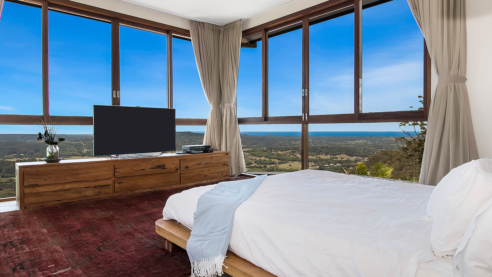 The Koonyum Range Retreat manages to find that perfect balance between exquisite seclusion and easy exploration. Its location in the Koonyum Range, which forms part of Mount Jerusalem National Park, means great bushwalks await literally at the end of the road. A 15-minute drive takes you to Mullumbimby, a delightful regional town home to a golf course, markets and fantastic dining options. Known as the counter-culture capital of the Byron Shire, Mullumbimby has a laidback, alternative vibe that’s bursting with small-town charm. Byron Bay’s town centre can be reached in around 30 minutes’ drive. Hit the beach to swim, surf and sunbathe, go whale spotting (seasonal) or visit one of the many bars, restaurants and cafés.