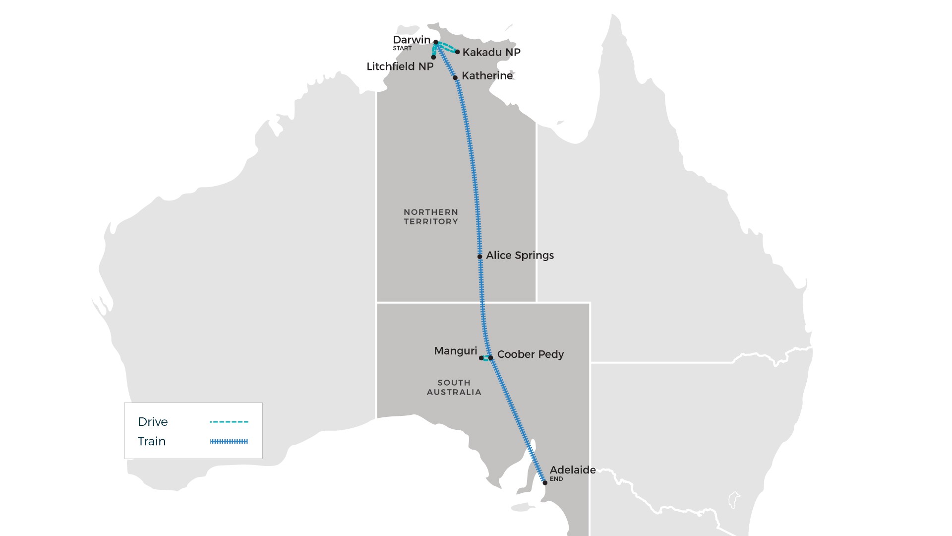 Your tour begins at Darwin Airport (DRW) and ends at Adelaide Airport (ADL) with shared roundtrip airport transfers. Platinum and Platinum Plus will receive private transfers.