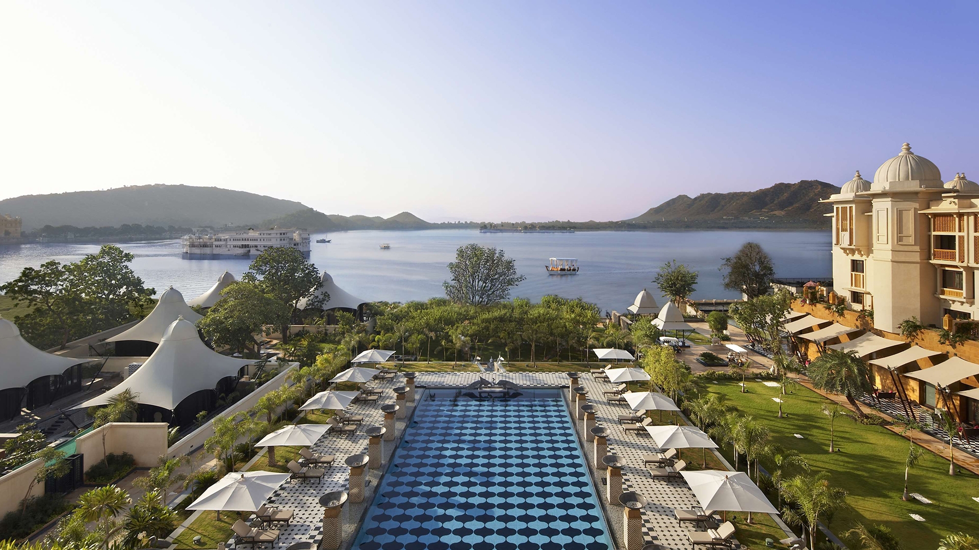 Transport yourself to an era of regal opulence at The Leela Palace Udaipur, poised along the pristine Lake Pichola, with the stunning Aravallis as its backdrop. A 45-minute drive from Maharana Pratap Airport Udaipur (UDR) and a six-hour drive from Jaipur, this palatial hotel exemplifies Rajasthani architecture and evokes the grandeur of Udaipur’s rich and royal heritage. The hotel’s rich architecture, hand-carved artwork, and artisanal crafts boost its majestic, unmistakable allure, making it seem as though it just stepped out of a dream. Enjoy an escape fit for royalty as you relax in the exquisitely built rooms, take a swim in the lake-facing pool, pamper yourself with traditional Indian spa treatments, and relish a variety of international cuisines on your plate.