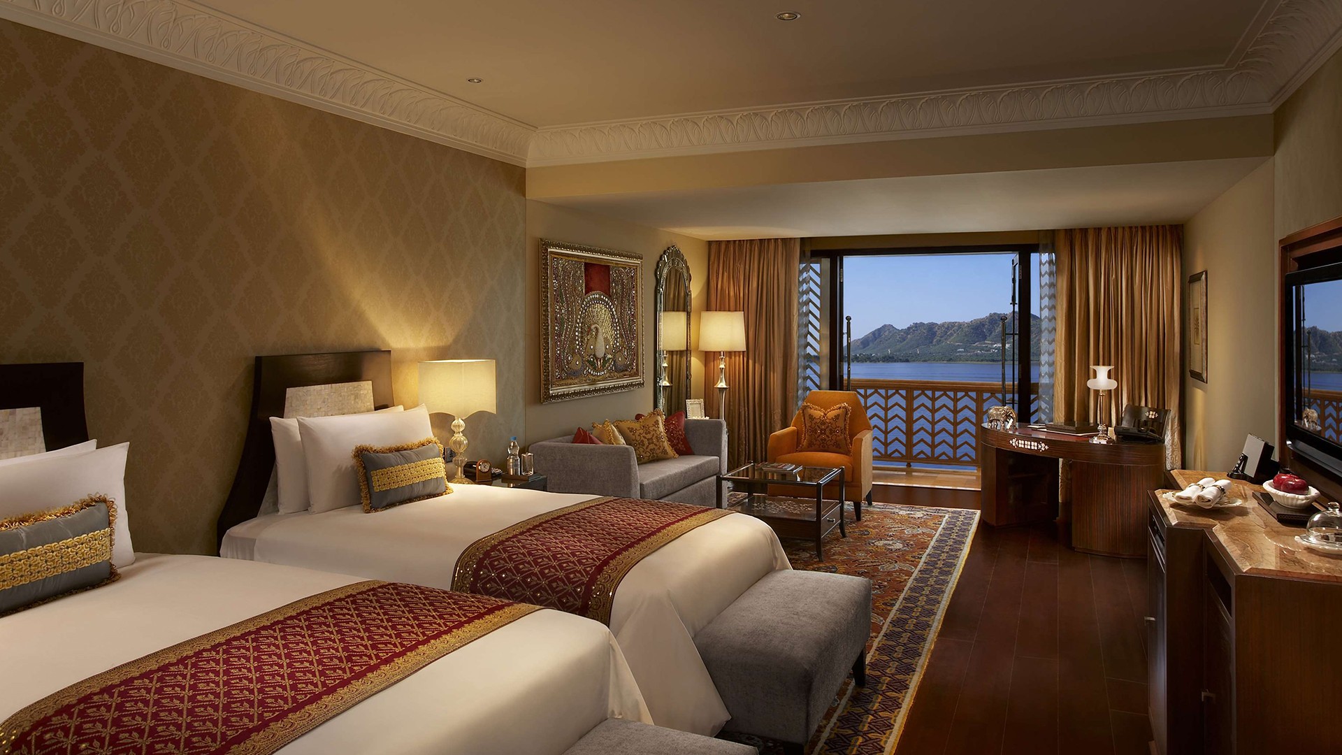 Grand Heritage Lake View Room With Balcony Upgrade Available: Soak in ultimate luxury as you take in panoramic views of the serene Lake Pichola from a private balcony, where you will be greeted by stunning sunsets.