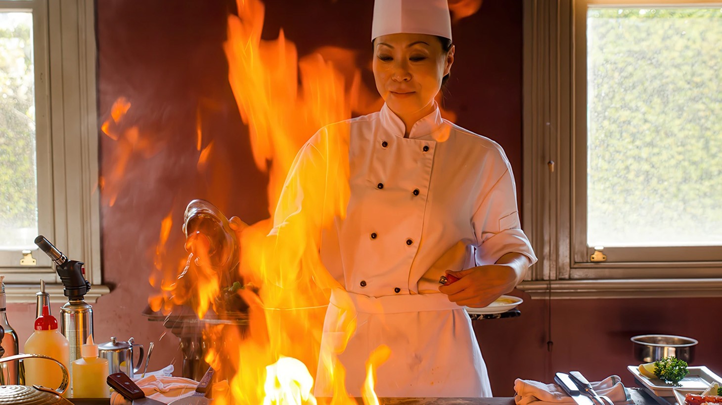 - Flaming No.1 Special: Crab salad with avocado wrapped in Hiramasa kingfish and flamed on the teppan with a secret sauce
