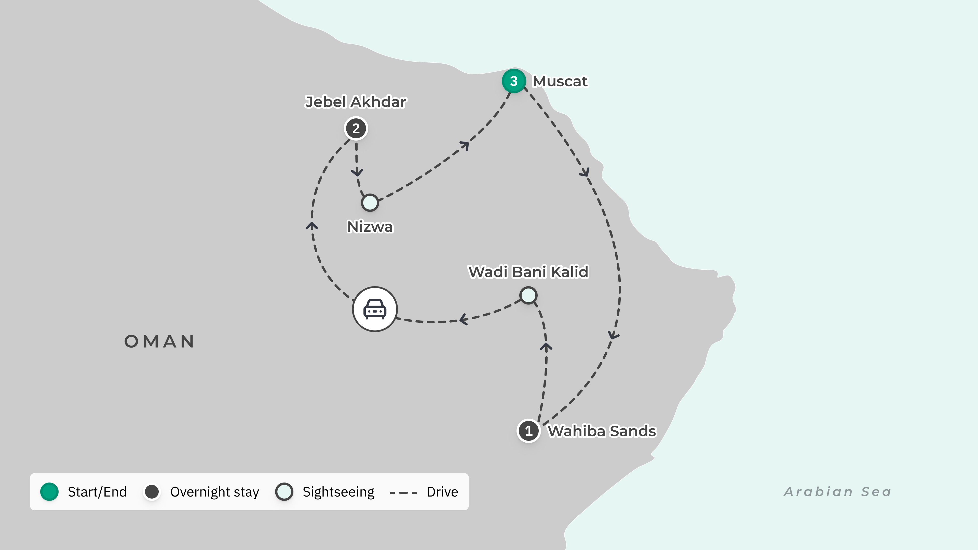 Your tour begins and ends at Muscat International Airport (MCT), with return airport transfers.