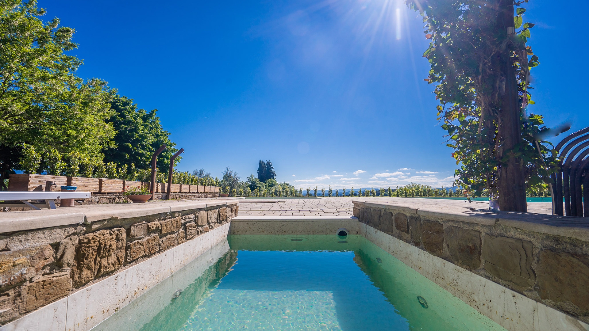 Located in the heart of the Chianti region in Montevarchi, a scenic 50-minute drive from Arezzo and just over an hour’s drive from Florence, Agriturismo Relais Campiglioni is a charming country estate surrounded by centuries-old olive trees and vineyards. Recently renovated, this rustic and elegant farmhouse counts just four apartments and six, spacious double bedrooms ensuring guests privacy and intimacy, together with two solar-heated saltwater swimming pools, a Jacuzzi and a sun terrace boasting beautiful views over the countryside.