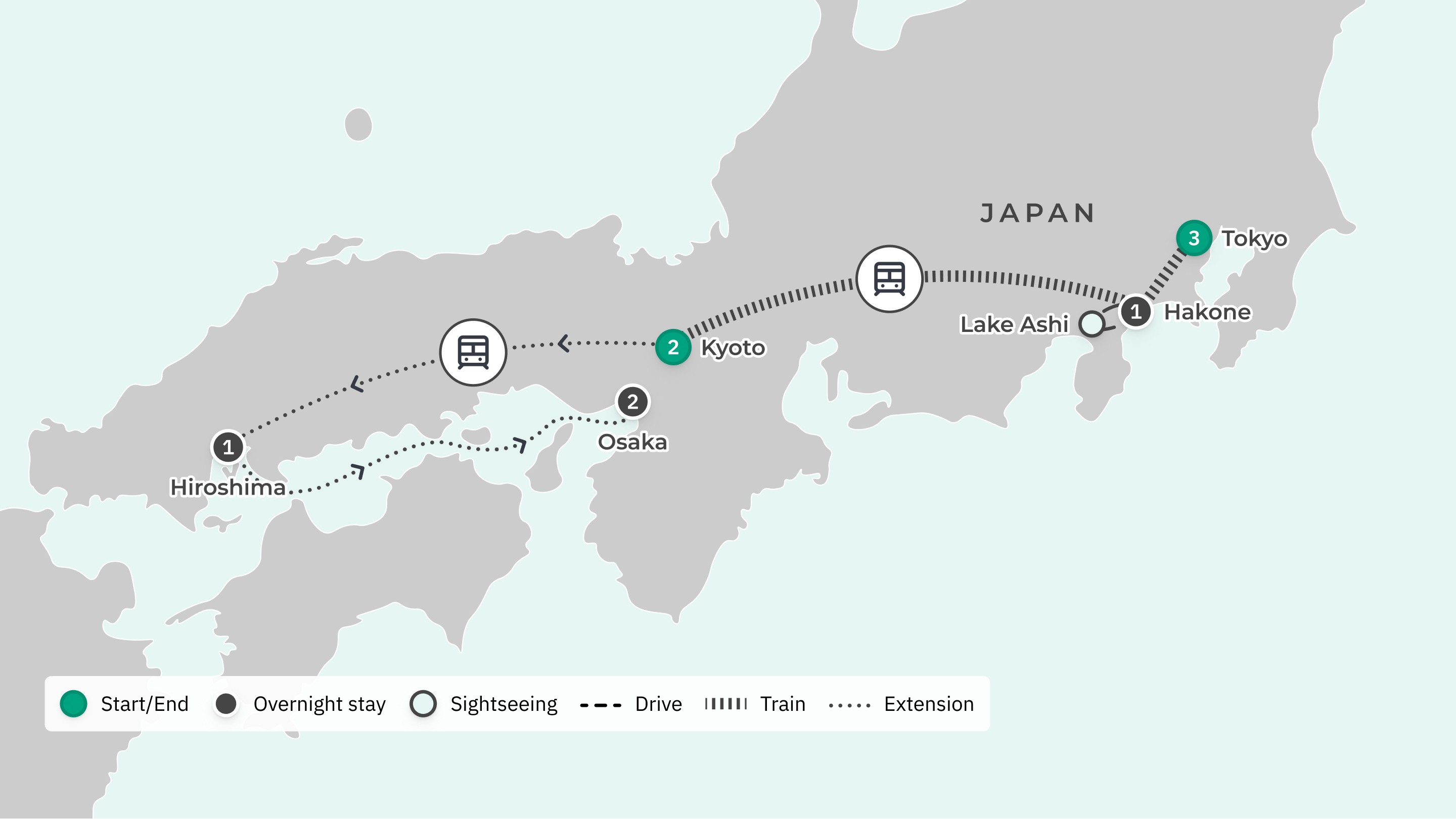 Your journey takes you to: Tokyo — Hakone — Kyoto.