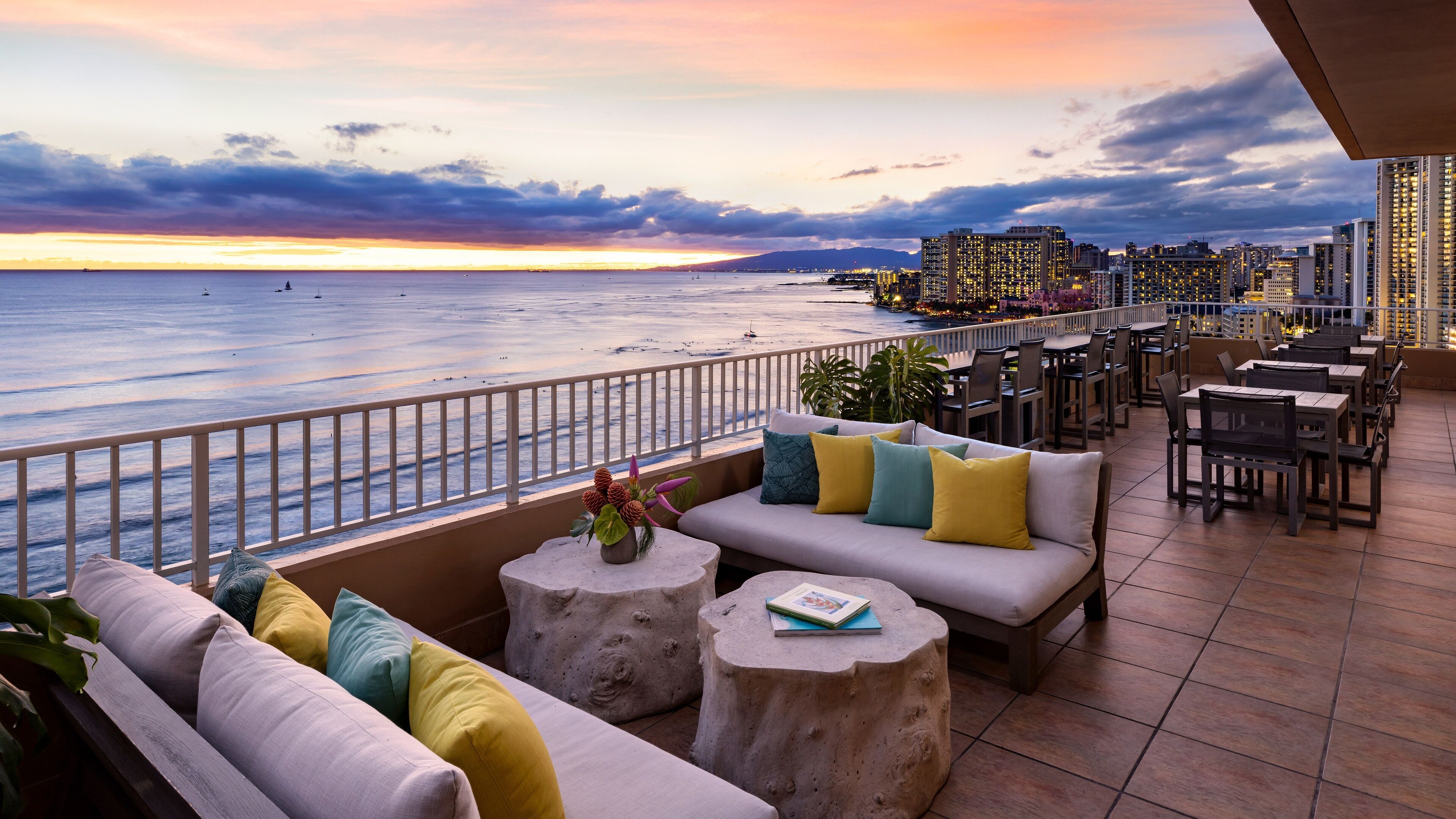 Every morning begins at the Coconut Club, where a full breakfast is served with sweeping views of Waikiki Beach, Diamond Head crater and the Pacific Ocean beyond. As the day winds down, Tiki’s Grill & Bar serves up casual Pacific Rim flavours with live Hawaiian music, while Sunrise Shack keeps things fresh with organic smoothies, acai bowls and cold brew just steps from the sand.