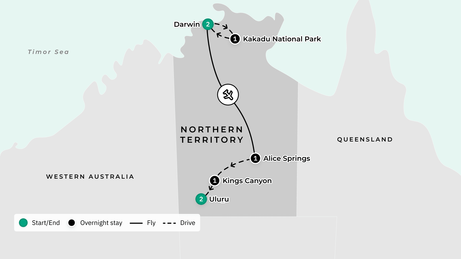 Your journey takes you to: Darwin — Kakadu National Park — Arnhem Land — Darwin — Alice Springs — Kings Canyon — Uluru.