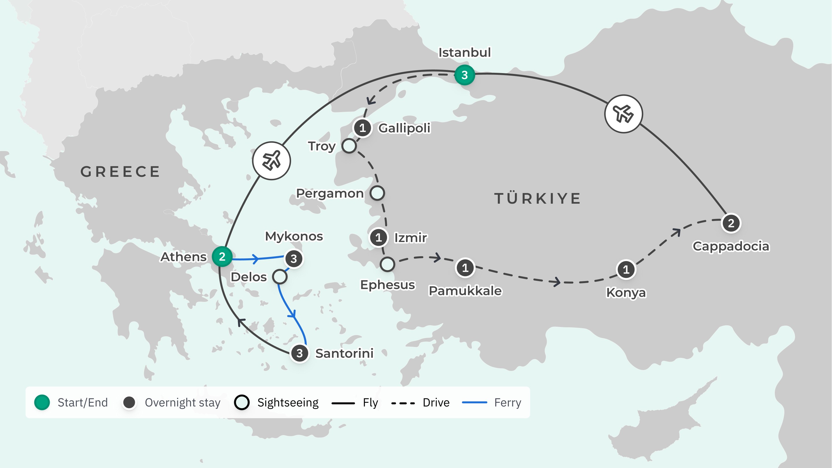 Your journey takes you to: Athens — Mykonos — Santorini — Athens — Istanbul — Gallipoli — Cannakale — Troy — Pergamon — Izmir — Ephesus — Pamukkale — Hierapolis — Konya — Cappadocia — Istanbul.