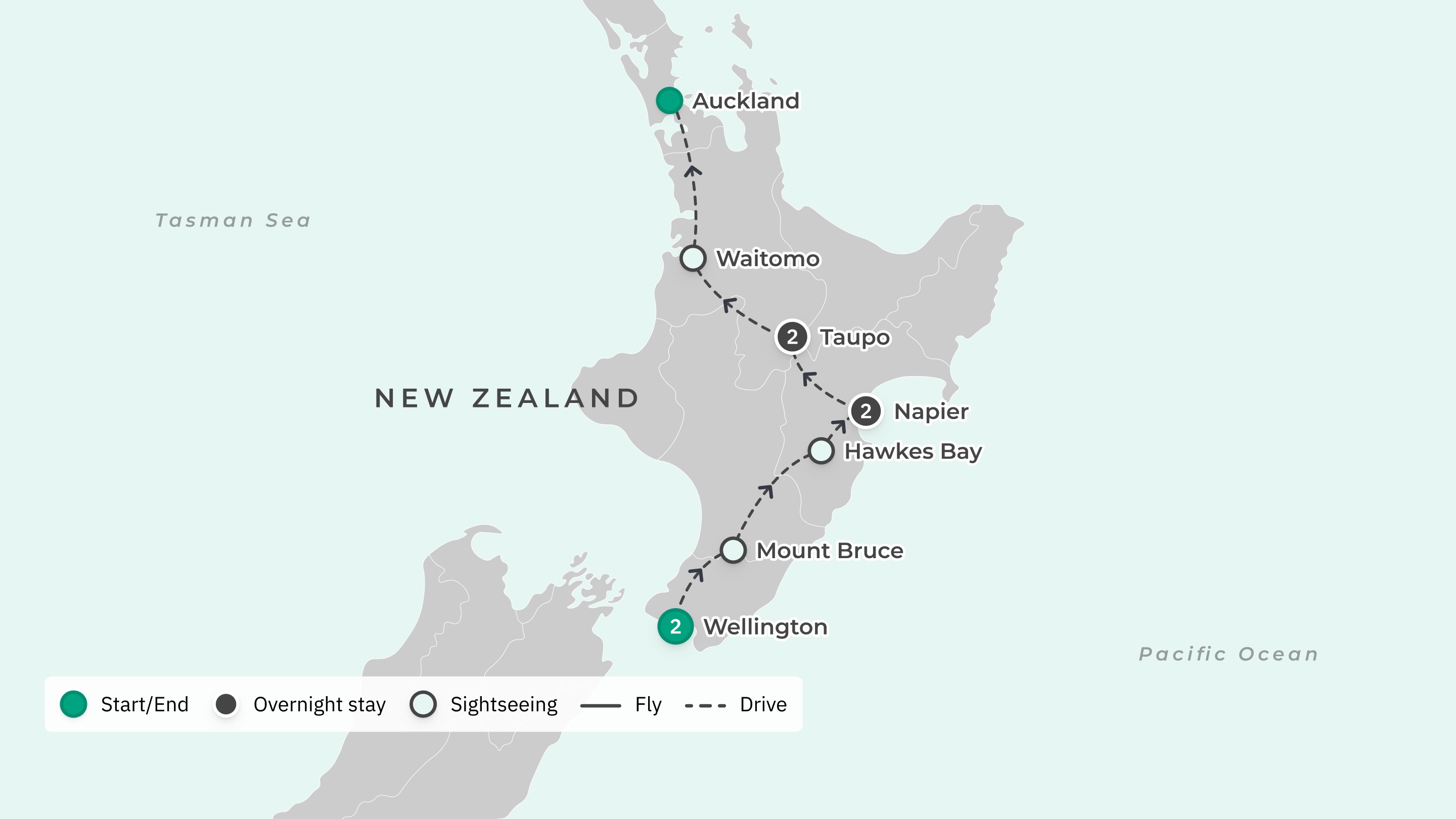 Your tour begins at Wellington International Airport (WLG) and ends at Auckland Airport (AKL) with airport transfers on arrival only.