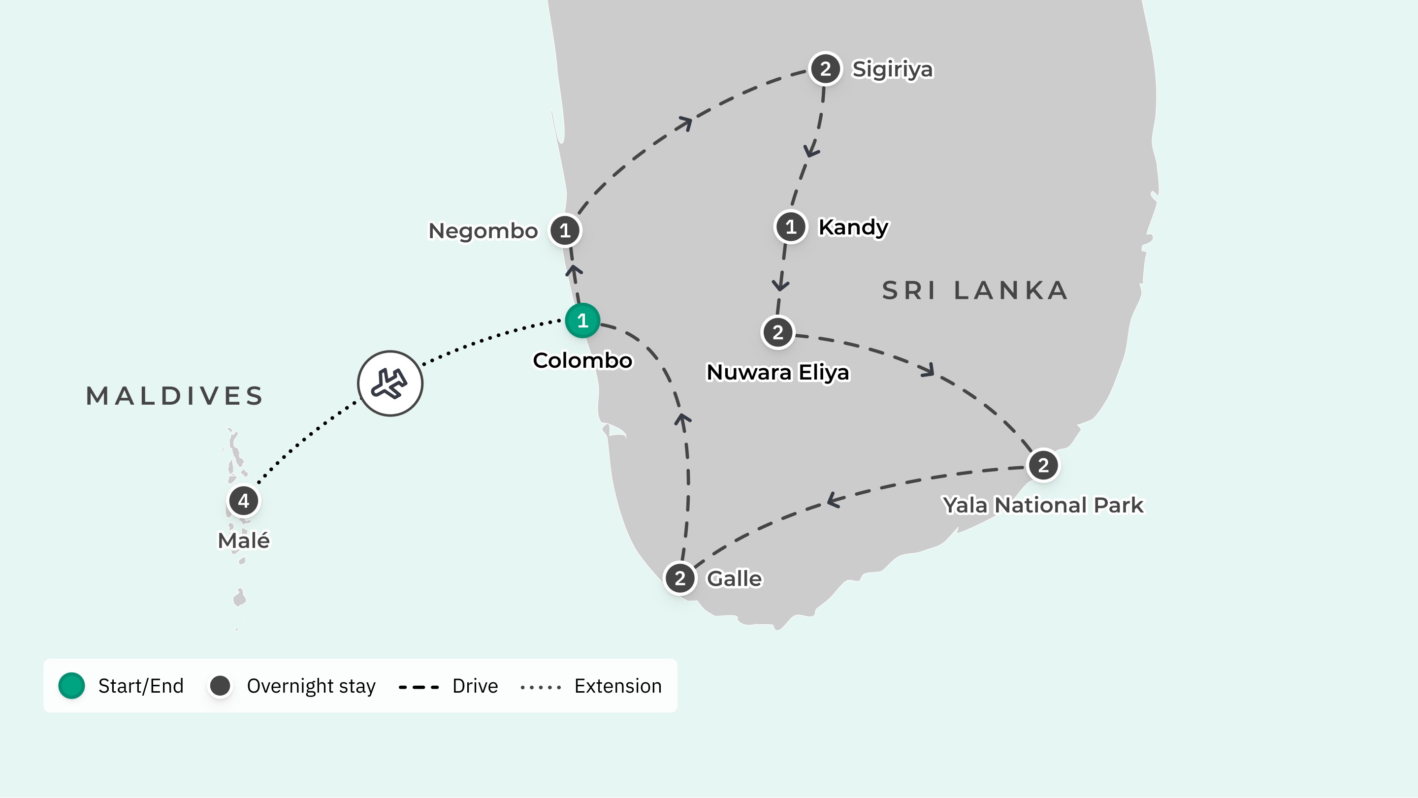 Your journey takes you to: Colombo — Negombo — Sigiriya —Matale — Kandy — Nuwara Eliya — Yala National Park — Galle — North Male Atoll, Maldives.