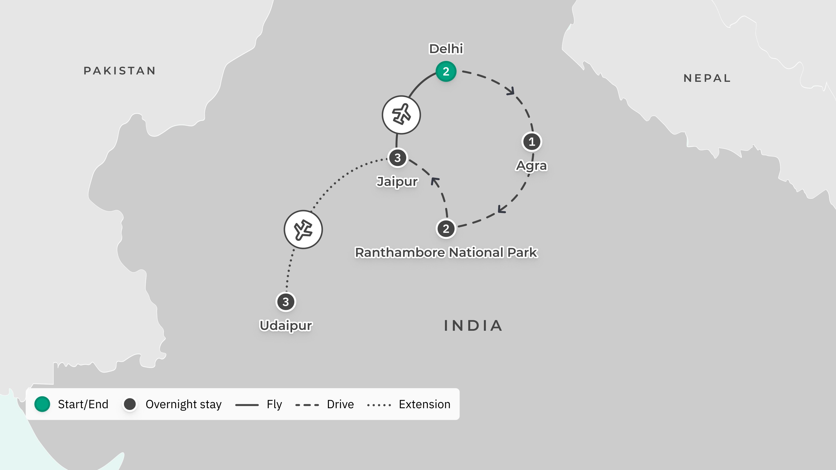 Your journey takes you to: Delhi — Agra — Ranthambore — Jaipur — Delhi.