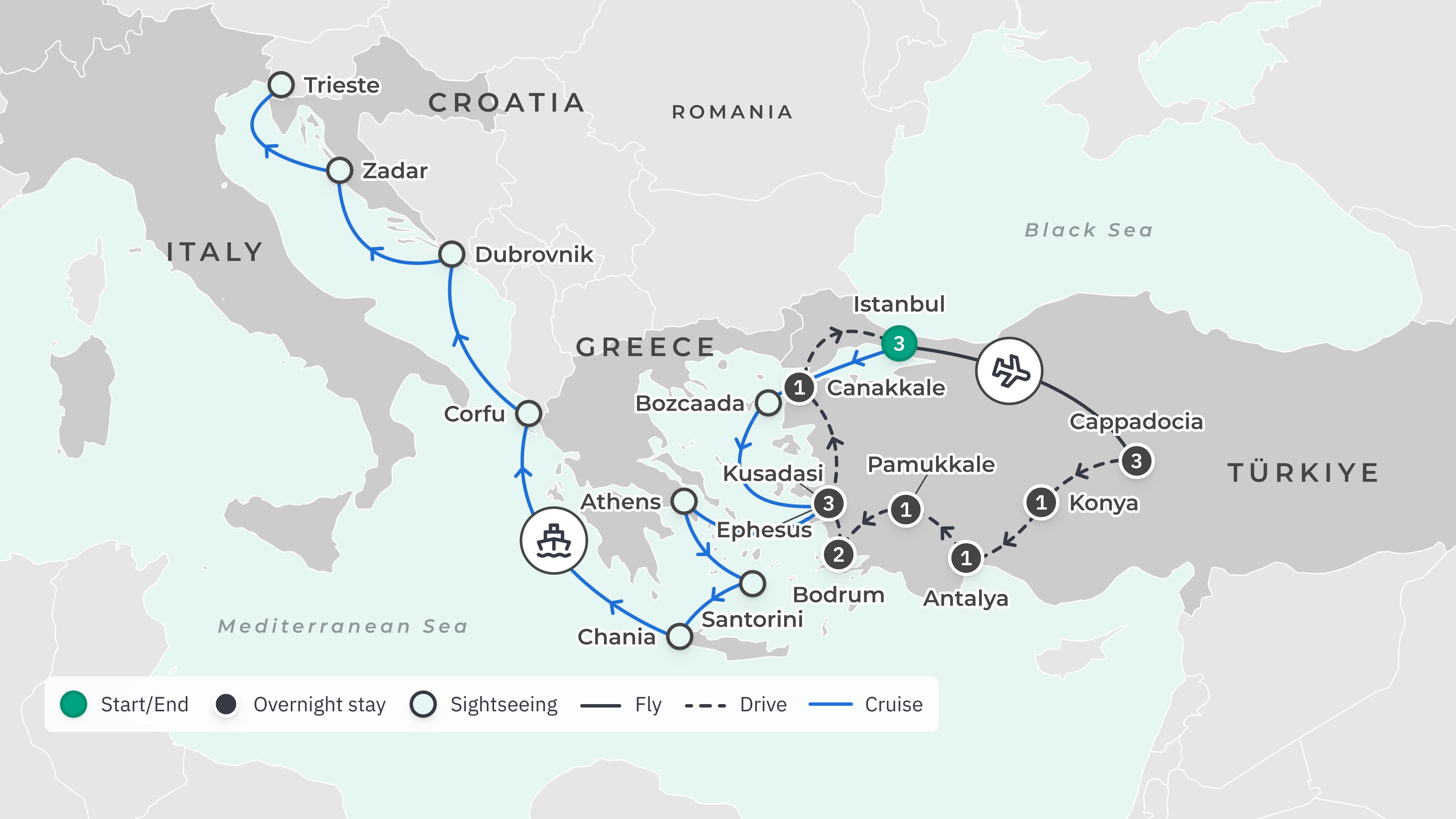 Your tour begins at Istanbul Airport (IST) or Sabiha Gokcen International Airport (SAW) and ends at Trieste port, with transfers included for the first and last day of your Türkiye tour itinerary only. Transfers are not included from Trieste port after cruise disembarkation.