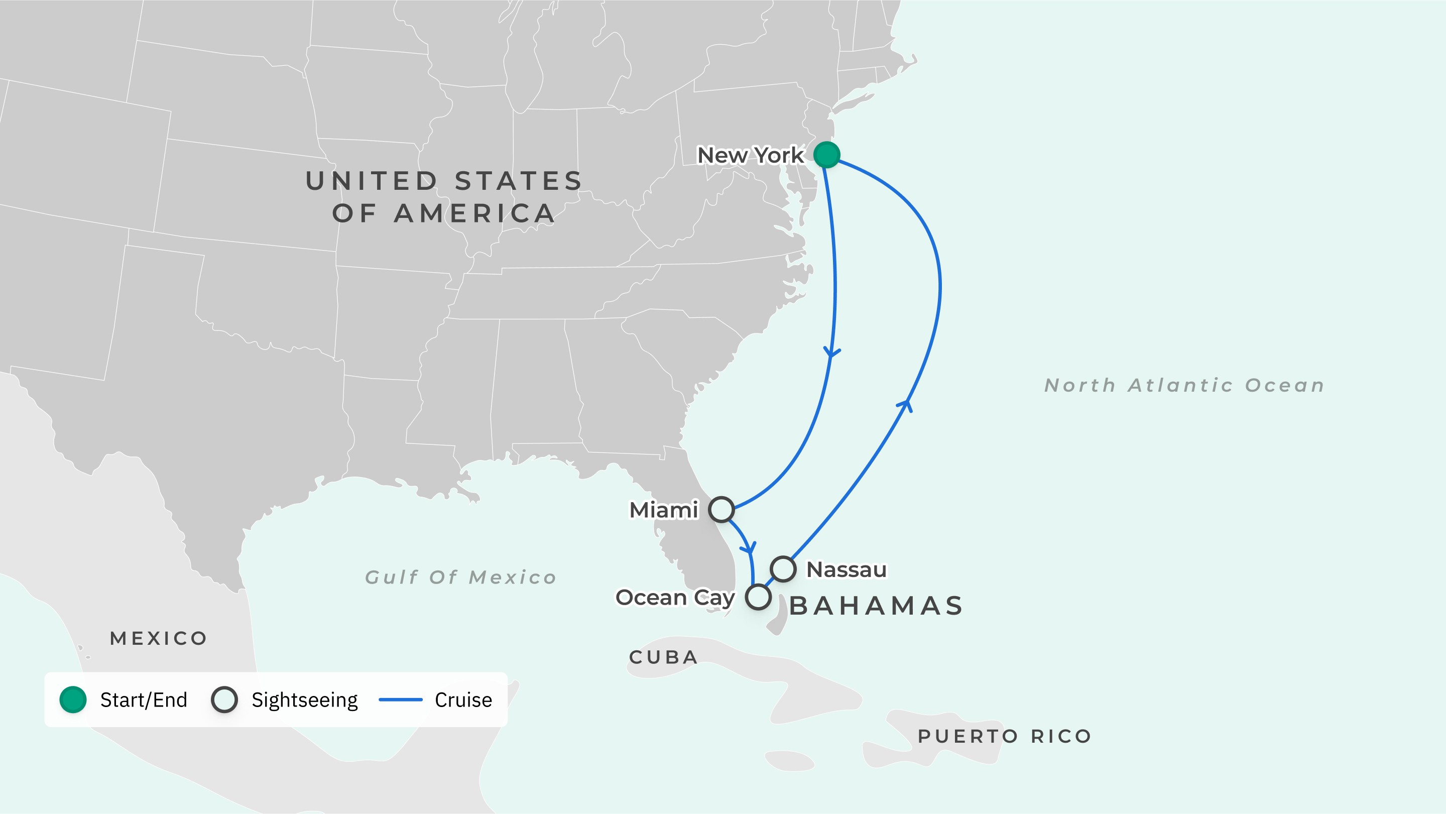 Your journey takes you to: New York City, USA – Miami, USA– Ocean Cay, Bahamas – Nassau, Bahamas – New York City, USA.