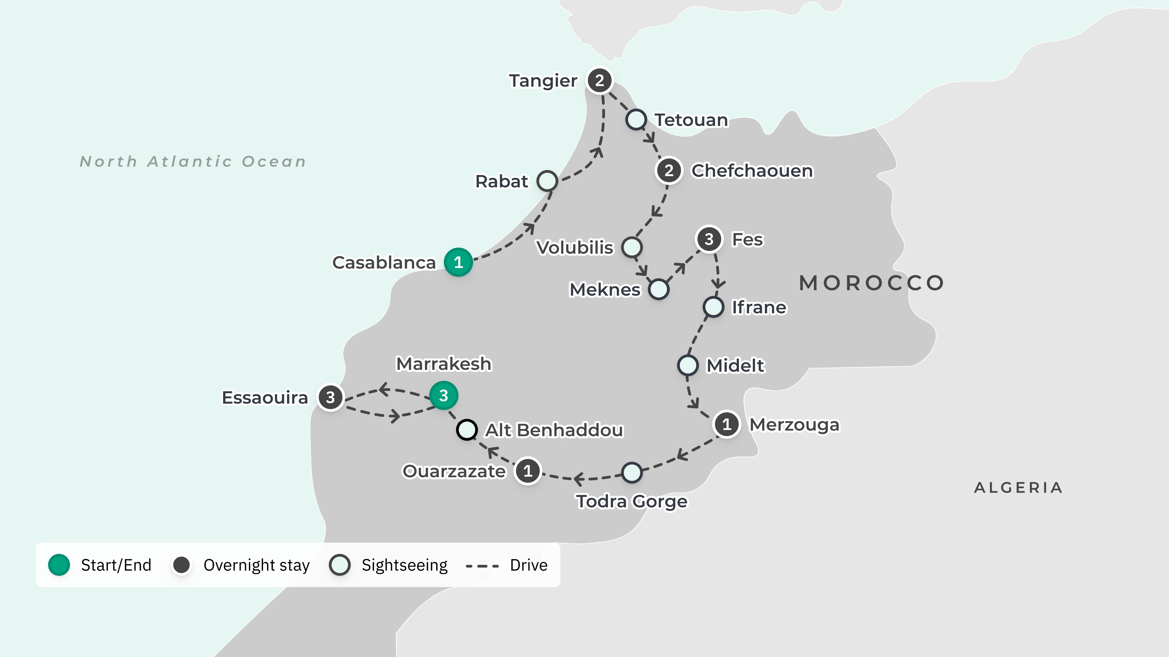 Your tour begins at Casablanca Mohammed V International Airport (CMN) and ends at Marrakech Menara Airport (RAK).