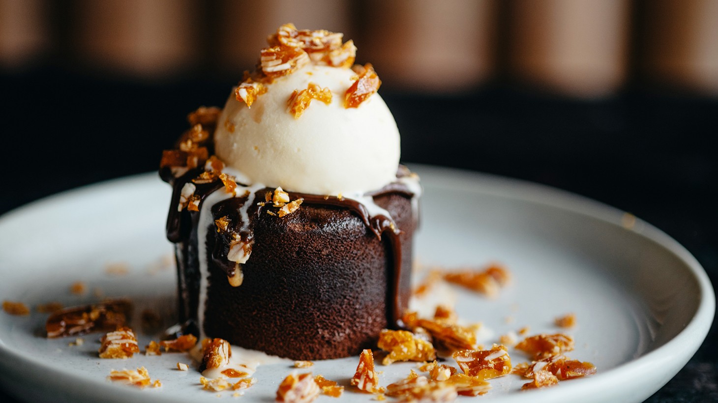 - Chocolate & Hazelnut Fondant: Melted salted caramel & chocolate sauce, white chocolate snow, hazelnut praline gelato